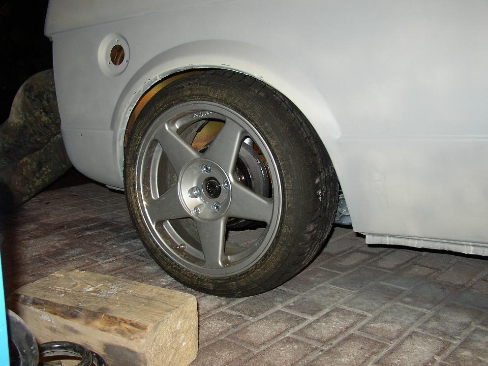 hinten eingebaut. Schnell mal die Felge drauf um zu schauen wie es so aussieht. Dann hat sich noch ein 80 Kilo Kumpel in den Koffernraum gesetzt. Genau so habe ich mir das mit dem Fahrwerk vorgestellt. Jetzt muss ich aber die Kanten umlegen, sonnst wird es eng.