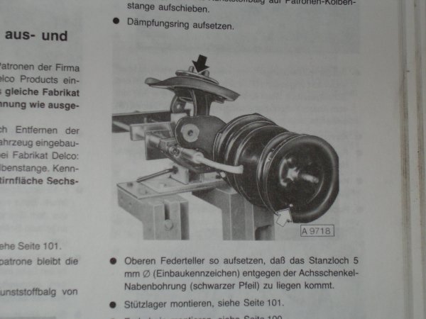 Oberen Federteller so aufsetzen, daß das Stanzloch 5mm (Einbaukennzeichen)m entgegen der Achsschenkelnabenbohriung( schwarzer Pfeil) zu liegen kommt.Das bild welches du braüchtest liegt darüber.