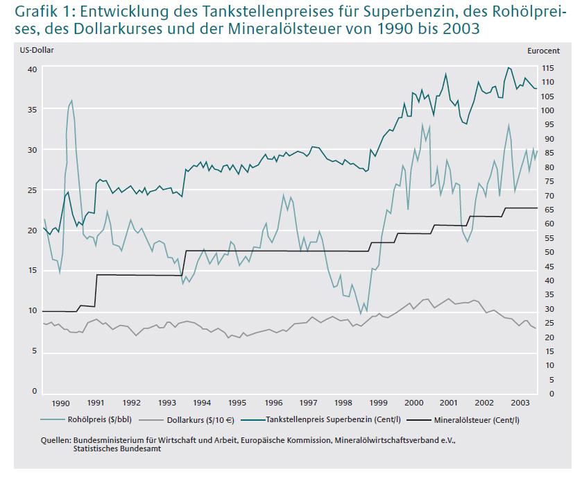 Zur Verdeutlichung hab ich mal ein Chart vom BMU angehängt das ziemlich deutlich die Verläufe des Ölpreises, des Dollarkurs, der Mineralölsteuer und dem durschnittlichen Tankstellenpreis für den Liter Superbenzin seit 1990 zeigt.