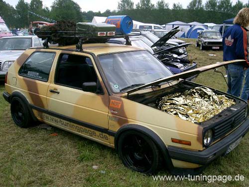 Finde das garnicht schön. Camouflage passt nur auf einem dicken PickUp. Aber nicht bei einem Golf2, A4, CRX oder Kadett.