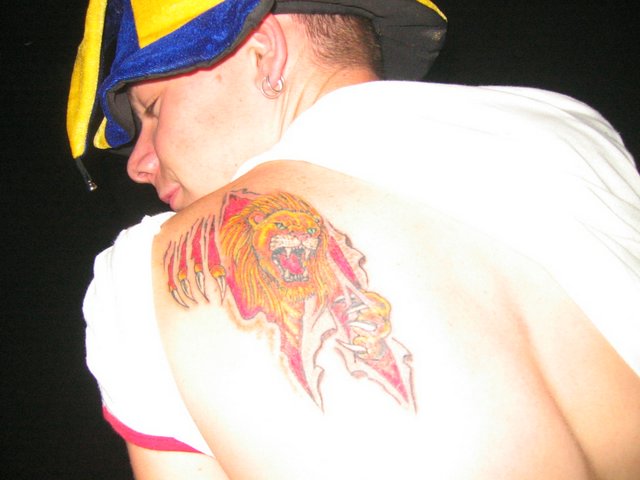 #30 Also ich hab nur links einen Ohrring , ein Zungenpiercing , ein kleines Tattoo aufm rechten oberarm und eins über den kompletten linken Oberarm! Bin aber noch lang net fertig! ALs nächstes wird auf der Rückseite vom linken oberarm ``BÖHSE`` und auf dem linken ``ONKELZ`` kommen! Denke ma das es aber Herbst wird bis ichs machen lass weil ich mich netmehr kurz vorm geilen Wetter bemalen lassen will!