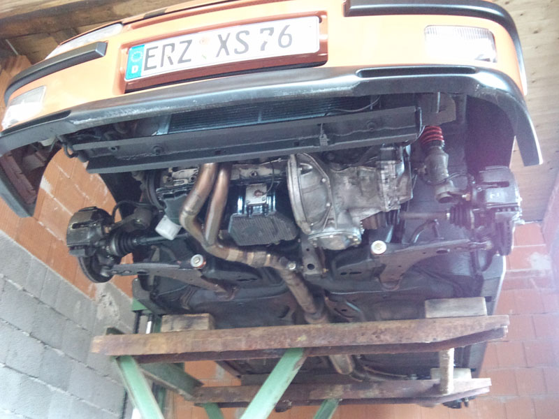 Ansonsten bin ich heute mit allem anderen fertig geworden. Der Motor läuft sehr sehr ruhig, Kühlsystem ist befüllt, die Ölwanne scheint bisher super dicht zu sein und die Kühlertraverse ist nun auch frisch versiegelt und wieder schön schwarz. Und dann hab ich beim Nachstellen vom Handbremsseil noch eingebrannt Blut- und Fellreste am Mittelschalldämpfer gefunden. Wahrscheinlich sind die noch von dem Feldhasen vom letzten Jahr. Aber komisch ist, dass die zur Fahrerseite hin sind und der Hase in beiden Radhäusern auf der Beifahrerseite Schaden angerichtet hatte.
