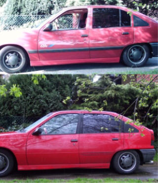 Hier hast mal ein Bild wo meiner auf Serienstahlfelgen 5,5x14 ET49 mit 185er Reifen steht. (Oberes Bild 60/60 und unteres Bild 60/40)