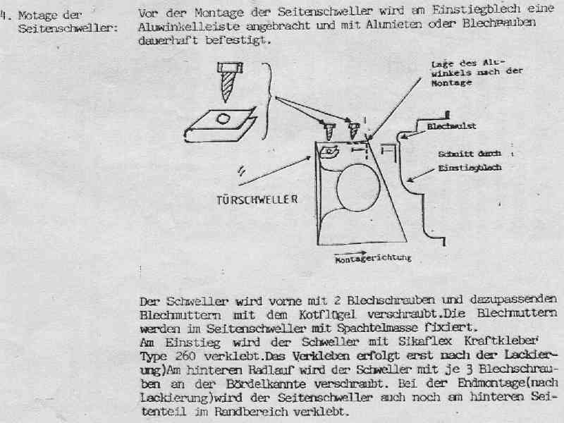 #13 Dabei sollte da nix sein. Ich hab den Teil der Anbauanleitung mal eingescannt. Nun sieht aber mein Schweller überhaupt nicht so aus wie auf der Zeichnung. Ach ja und sobald mein Handy wieder bereit ist die Bilder aus sich runterladen zu lassen gibts Bilder wie der Schweller endet: nämlich ohne "Lippe" sondern dafür mit ner 3mm Kante.