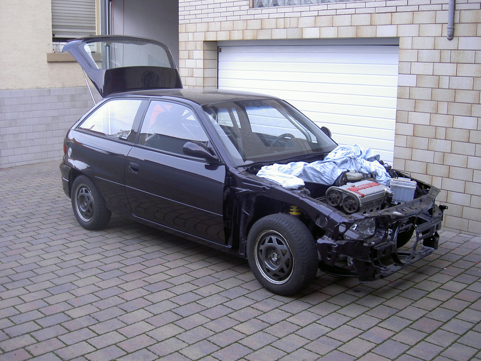 Hier nochmal ein Bild vom Astra!Den Astra habe ich 2001 im September gekauft!Habe Ihn dann 2 Jahre gefahren!Danach habe ich mir einen Vectra 2000 gekauft und den Astra zum meinem ersten grossen Projekt gemacht!Nachdem ich ihn Komplett zerlegt hatte kam natürlich das grosse erwachen!"Rost! Den musste Suchen"Schweller Radläufe Dome Vorne alles Faul!Was tun sprach Zeus!Alte Karosse fit machen oder andere her?Durch Zufall habe ich bei einem Autohaus in der Nähe dass richtige gefunden!Eine Original Opel Astra F CC BJ 1997 Rohbaukarosserie !Der Besitzer wollte sie als Rennwagen eigentlich benutzen!Doch kam nie dazu und so stand sie bis 2003 bei Ihm in der Firma eingeölt damit nichts drankommt!Nach langen Verhandlungen habe ich sie dann gekauft!Seitdem schraube ich Tag für Tag ,Woche für Woche immer ein wenig daran rum!Aber bis Nächstes Jahr will ich den Astra Fertig haben!