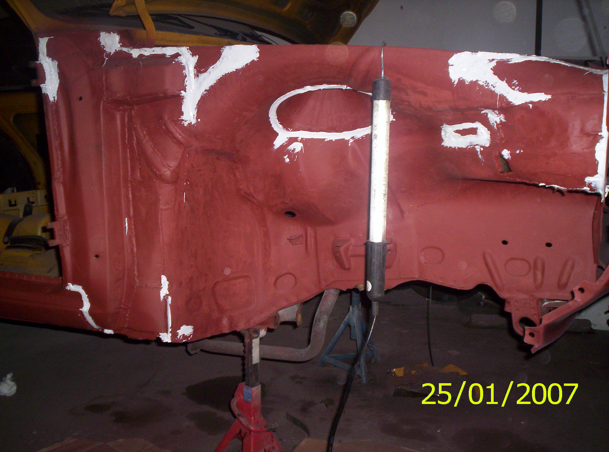 das radhaus ist nun soweit fertig,schweller wurde auch gleich mit blank gemacht und behandelt. nachdem das fertan gut 2 tage eingewirkt hat. dann schön abgewaschen und rostschutz drauf. heute hab ich dann noch bischen abgedichtet das bald der steinschlagschutz drauf kann,danach wagenfarbe.