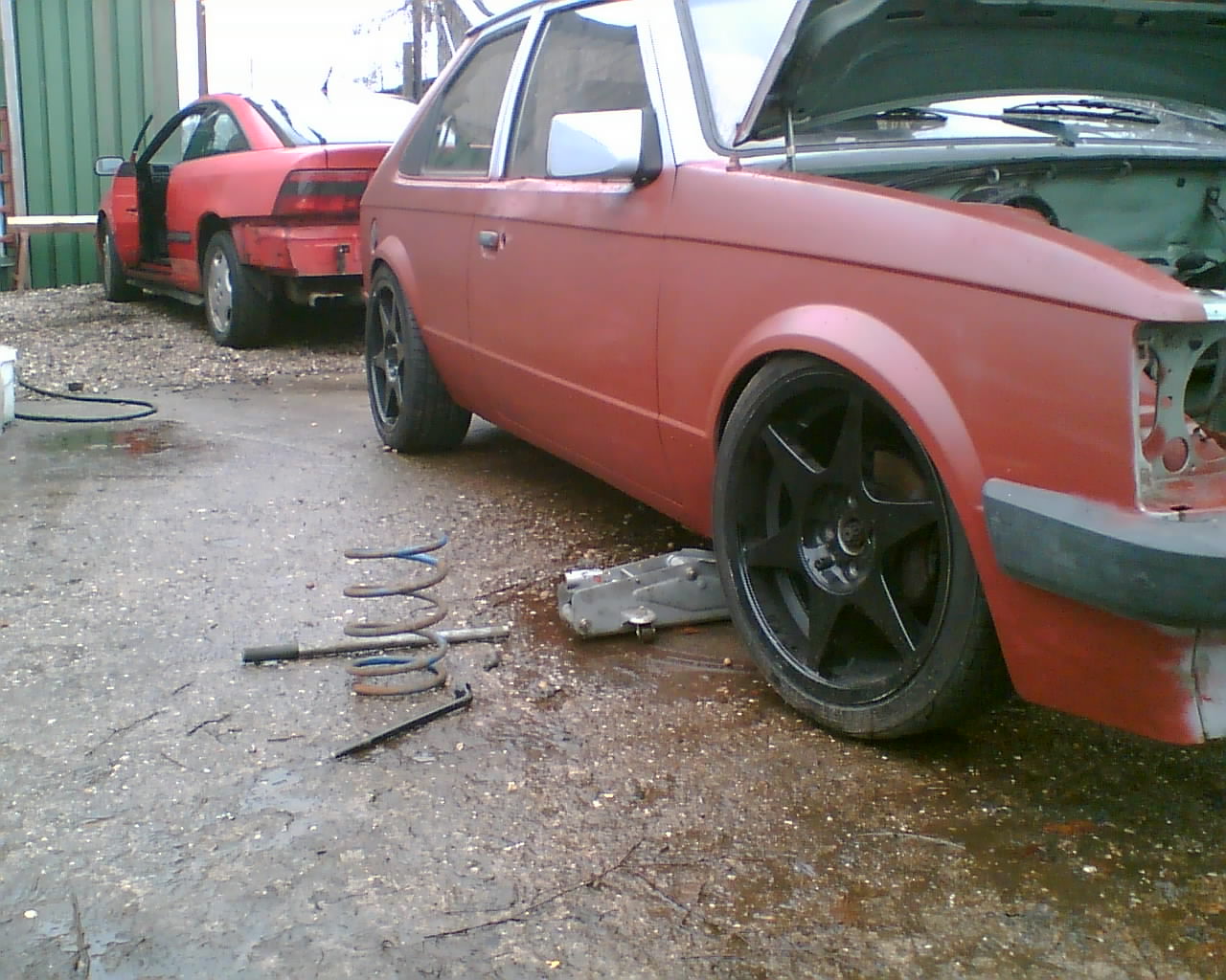 Wie Tief kommt er mit 80er Federn kurze Konis in Astra Federbeine????? So wie auf dem Foto gefällt mir das schon ganz gut auf dem Bild ist keine Feder drin!!!!!!.AmWE werde ich den 16V Motor schonmal Reinhängen.Spender Cali wird nächste Woche abgeholt.