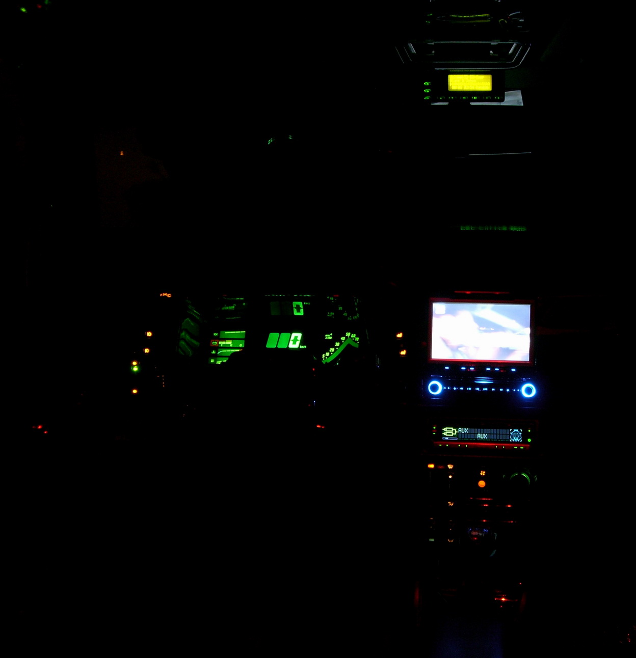 Viel weniger Farben geht ja kaum, das Digi-board und das MID hab ich von bernstein auf grün geändert passend zur Anzeige der M-Station und den Tastern des eigentlichen Radios, die LED im Lüftungsdüsenversteller ist eben so grün. Die Leds für die I und O Stellung der Lüftungsdüsen sind in gelb gehalten, was schon wieder fast zu der original belassenen Beleuchtung der ganzen Schalter passt, die habe ich nämlich nicht auf grün umgebaut da das spätestens beim bei dem orangenen Punkt des Lüftungsreglers komisch ausgesehen hätte.