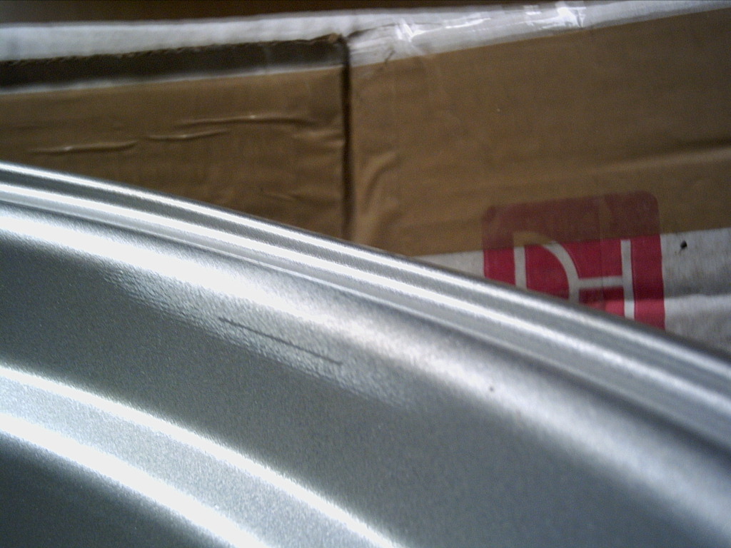 Habe heute eine neue Felgen geliefert bekommen,mein Nachbar hat sie angenommen. Habe sie gerade freude strahlend ausgepackt und auf der Innenseite ist sie sichtlich eingedellt. Habe mir dann den Kartonn mal genau angesehen und da ist mir aufgefallen,dass der Karton an eine Stelle rund beschädigt. Also so, als ob der Kartonn runter gefallen ist und auf dieser Ecke aufgeschlagen, so das das Innere Felgenhorn den Kartoon durchgeschlagen hat und da ist auch der Schaden an der Felgen.