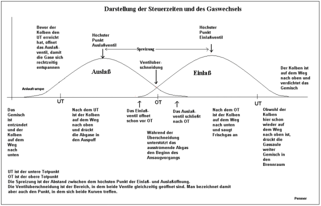 Der Auslaßbeginn muß vor UT liegen, um die Abgase, die ja unter Druck stehen, rechtzeitig in den Auslaß strömen zu lassen, damit der Kolben in seiner Aufwärtsbewegung nicht gegen einen Überdruck arbeiten muß. Das Auslassventil ist aber beim Erreichen des OTs noch geöffnet, weil die Strömung des Abgases so den Beginn des Ansaugvorgangs unterstützen kann. (Nur durch diesen Effekt sind Füllungen über 100% überhaupt möglich). Auch diese Werte sind immer ein Kompromiss, der bei niedrigen Drehzahlen einen Teil der Energie verschenkt. Wichtig bei diesen Vorgängen ist auch die gute Spülung des Brennraums von verbrannten Gasen. Der Kolben kann mit seiner Aufwärtsbewegung nur den Hubraum leeren. Ohne die Überschneidung der Steuerzeiten würde ein Teil der Füllung aus praktisch sauerstofflosem Abgas bestehen.