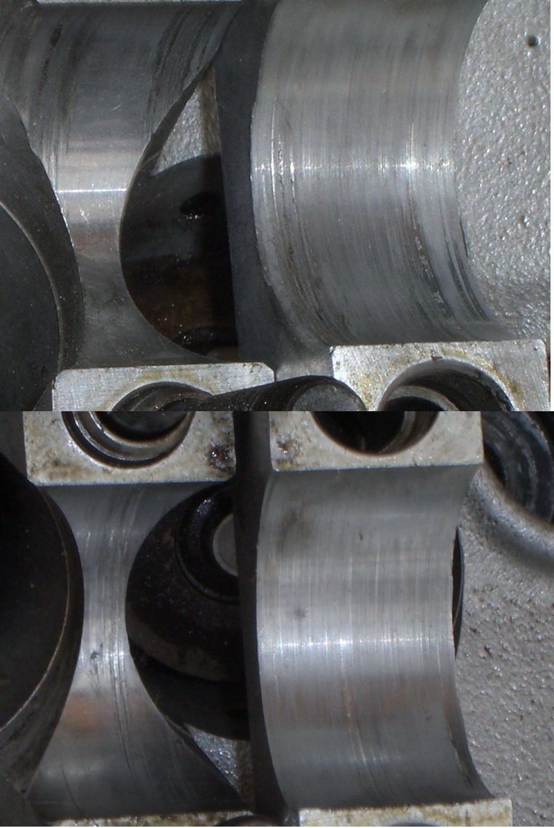 Das obere Bild ist der 'Nockenwellenbock' (oder wie nennt sich sowas?) welcher dem Verteiler am nächsten sitzt und das untere Bild ist der darüber. Die anderen haben verschwindend geringe Spuren, wenn es nicht sogar nur Ablagerungen sind, was ich sogar für wahrscheinlicher halte.