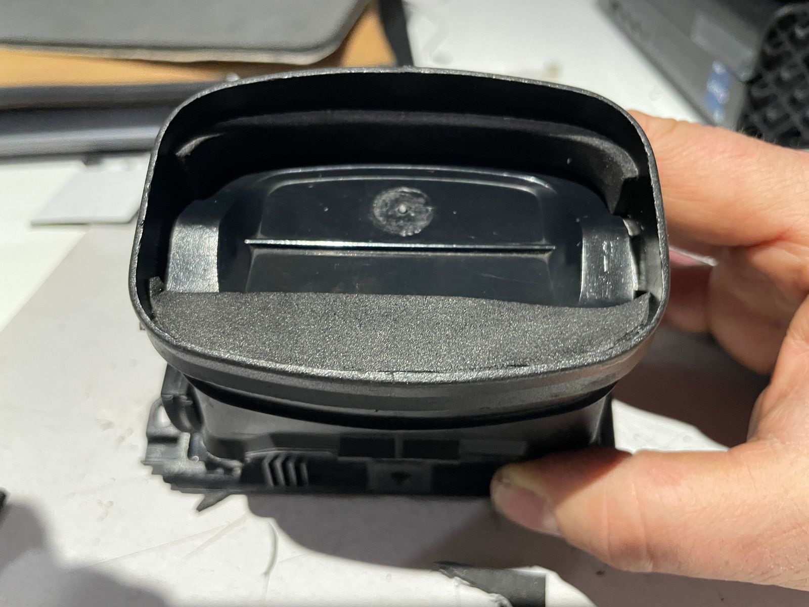 Es ist aber schon ein bisschen ein Mist mit den Dichtungen. Ich hatte einseitig klebendes Moosgummi da. Dieses dann genau so zu schneiden, dass es rings herum abdichtet aber nicht ansteht ist mühselig. Ich hab dann noch zusätzlich einen Streifen in den Kanal geklebt bzw. auf die Klappe. Aber so funktioniert das jetzt wieder.