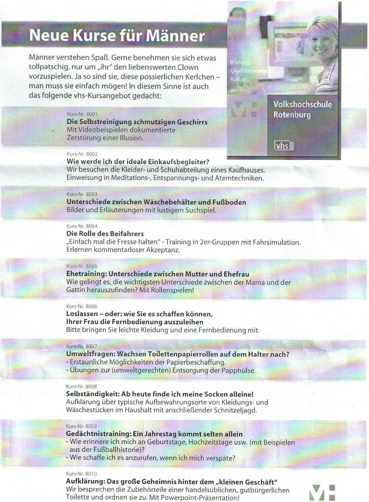 Liebe Leute, schrauben ist ja schön und gut- aber doch nicht nur! Die Volkshochschule Rotenburg bietet neue interessante VHS-Kurse für Männer an. Ich habe euch das Prospekt mal eingescannt!