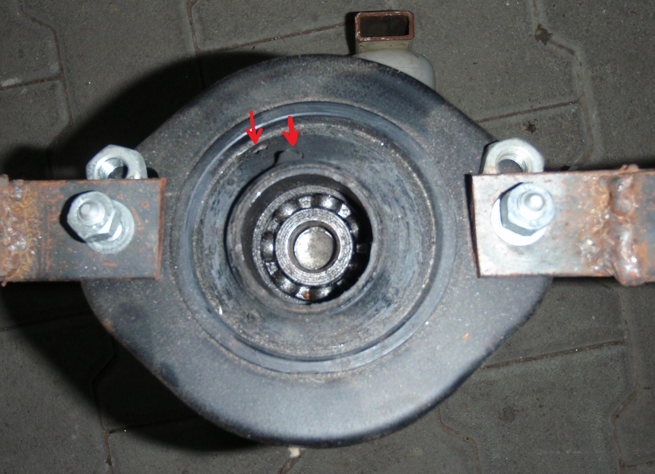 Ich habe mal ein paar Bilder von dem noch immer eingespannten Domlager gemacht. Wie man vielleicht erkennen kann ist mitlerweile eine größere Bruchstelle mitten im Gummi und eine kleinere etwas weiter unten am äußeren Rand des Lagers entstanden.