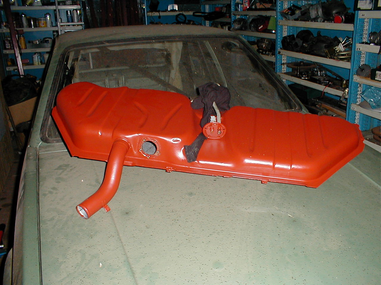 Alls erstes fast fertiges Teil kann ich jetzt schon mal den Tank zeigen. Der war echt total angegammelt. Von oben schon stark angerostet und auch das Rohr von Tankstuzen war stark befallen. Unten hab ich den Unterbodenschutz entfernt und dann den ganzen Tank mit Drahtzopf, Schrubscheibe und Sandstrahlpistole bearbeitet. Danach bekamm er insgesammt 4 Anstriche mit Rostschutzfarbe. So sieht er jetzt aus. Als nächstes soll er noch gelackt werden.