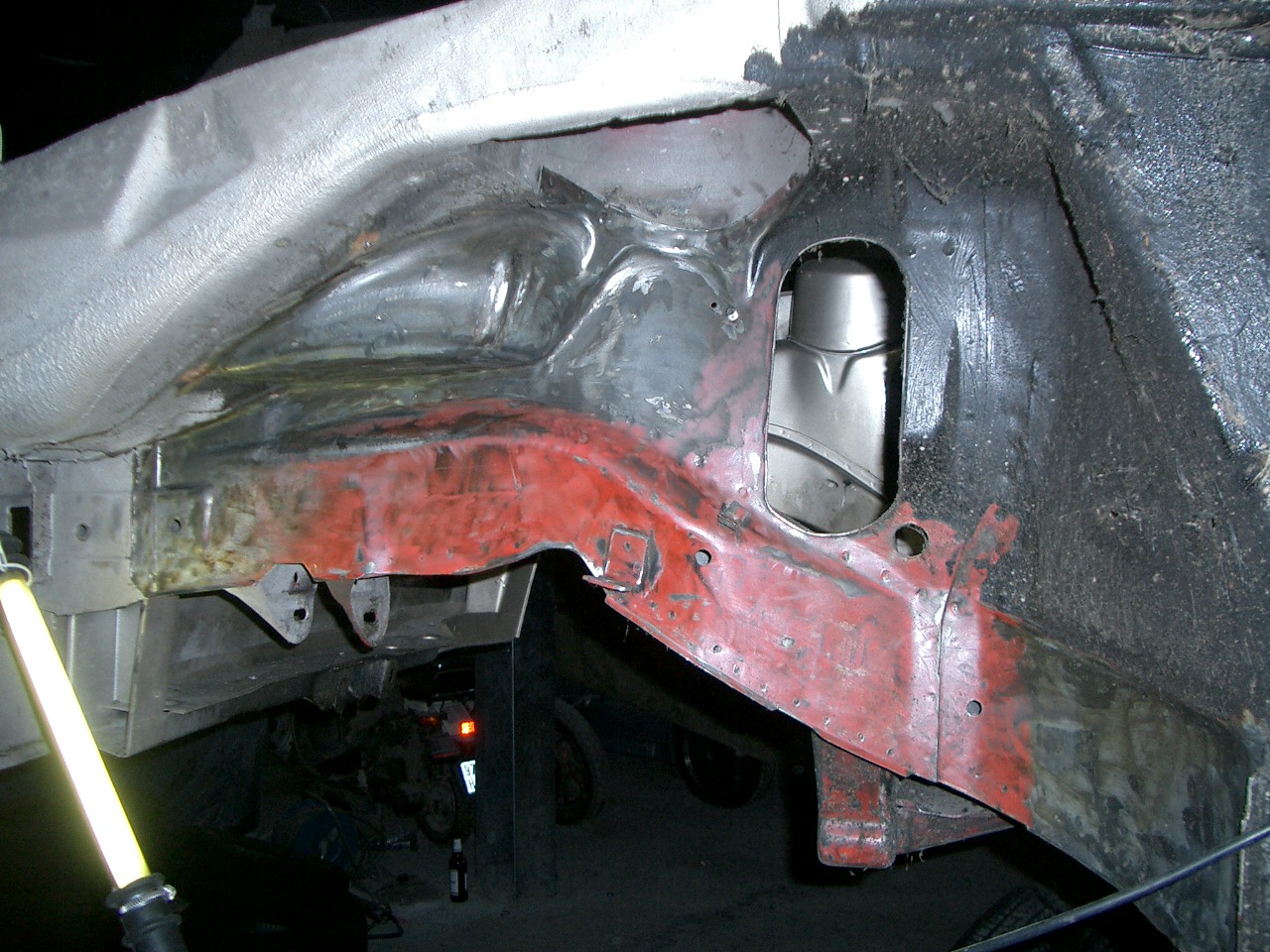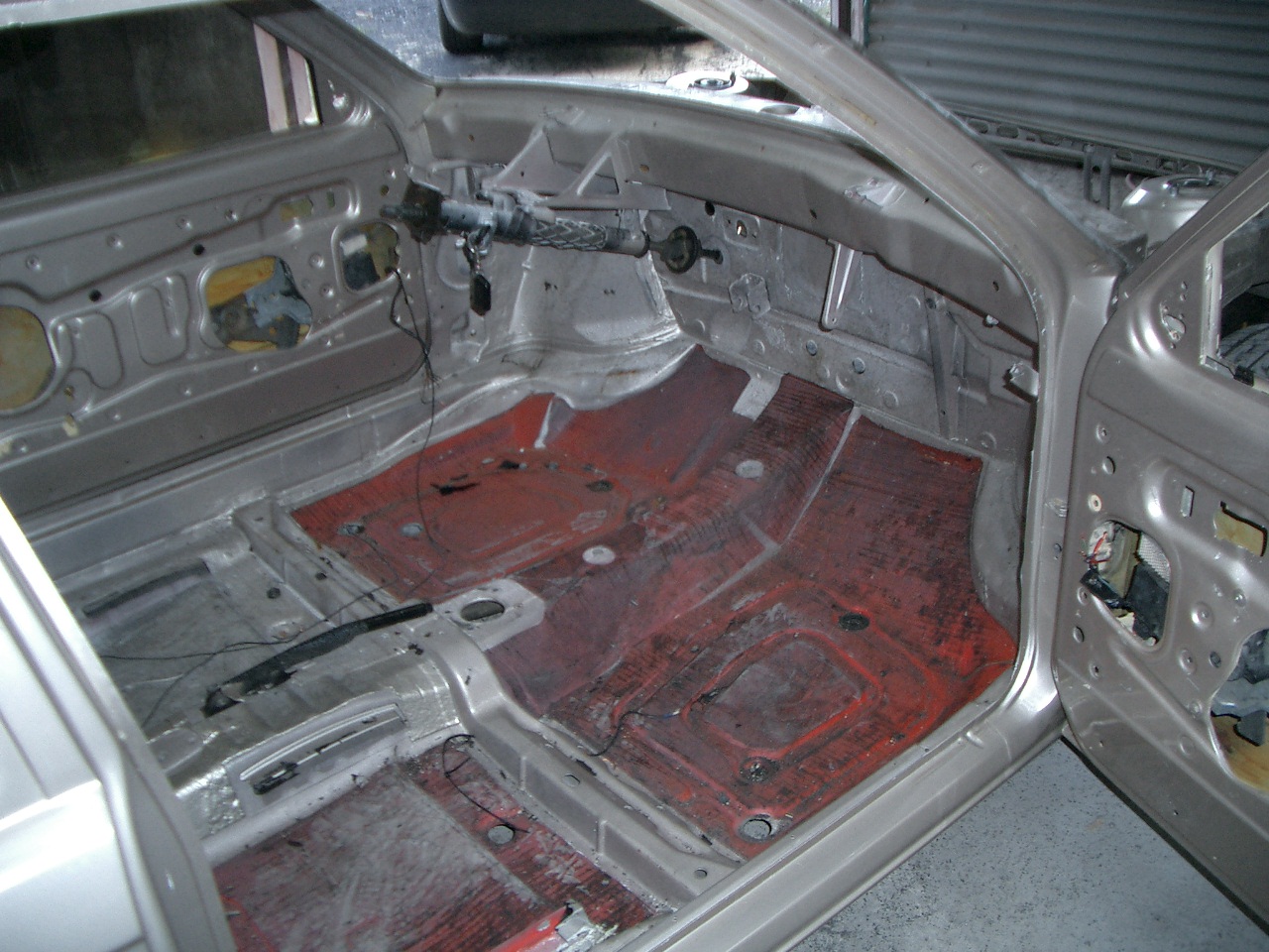 So, heut hab ich mal so richtig in die Tasten gehauen, der D ist jetzt komplett lehr, bis auf die Hinterachse, hab festgestellt, das es sich auf der Bühne am Unterboden doch ganz gut arbeiten lässt, hab im Innenraum alle Bitumatten entfernt und angefangen die Innenradhäuser blank zu machen.