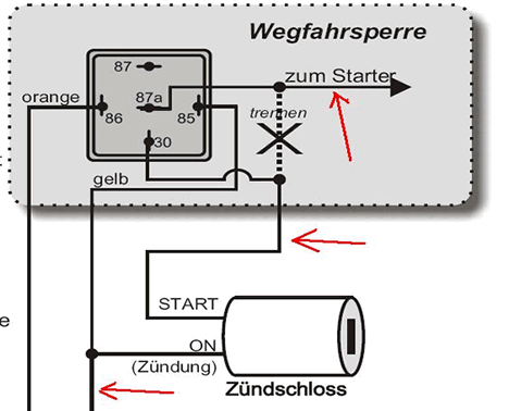 Das der Zündung ist rot oder rot/weiss, wenns rot ist müssten zwei rote da sein einmal zuleitung und einmal abgang musst mal gucken wo die hingehen...