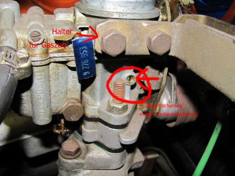 So, hier kommt das Bild. Also die eine Seite, das ist eine Eingriffsicherung, möglicherweise liegt dahinter die Teillastregulierungsschraube. Absolut tabu, bei deinem Vergaser fehlt zunächstmal der Halter für den Gaszug-oder du hast ihn abgebaut, kann ich also nicht sagen. Siehe Bild.