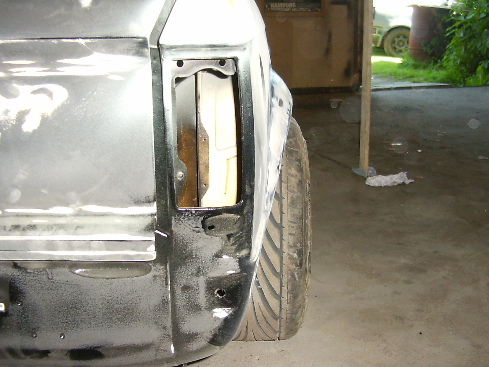 Werd am WE noch mal ein paar Fotos machen,wir haben heut morgen vorne auch noch mal ne Felge draufgebaut und die Radläufe gespachtelt.