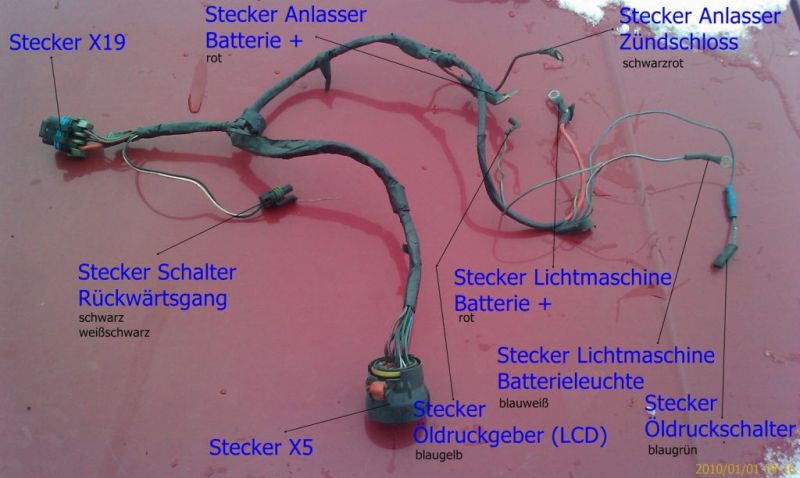 Am Kadett D Kabelbaum bleiben dann zwei Kabel von der Zündspule, eins vom Verteilerkondensator und eins vom Anlasser übrig.