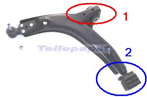 Der Querlenker ist exakt an einem Punkt richtig mit der Karosse verbunden und zwar über die lange Buchse mit dem vorderen Längsträger (siehe Bild Punkt 1). Der zweite Befestigungspunkt (Bild Punkt 2) ist lediglich ein Gummiblock in den der Querlenker mit einem Dorn eingeschoben wird.