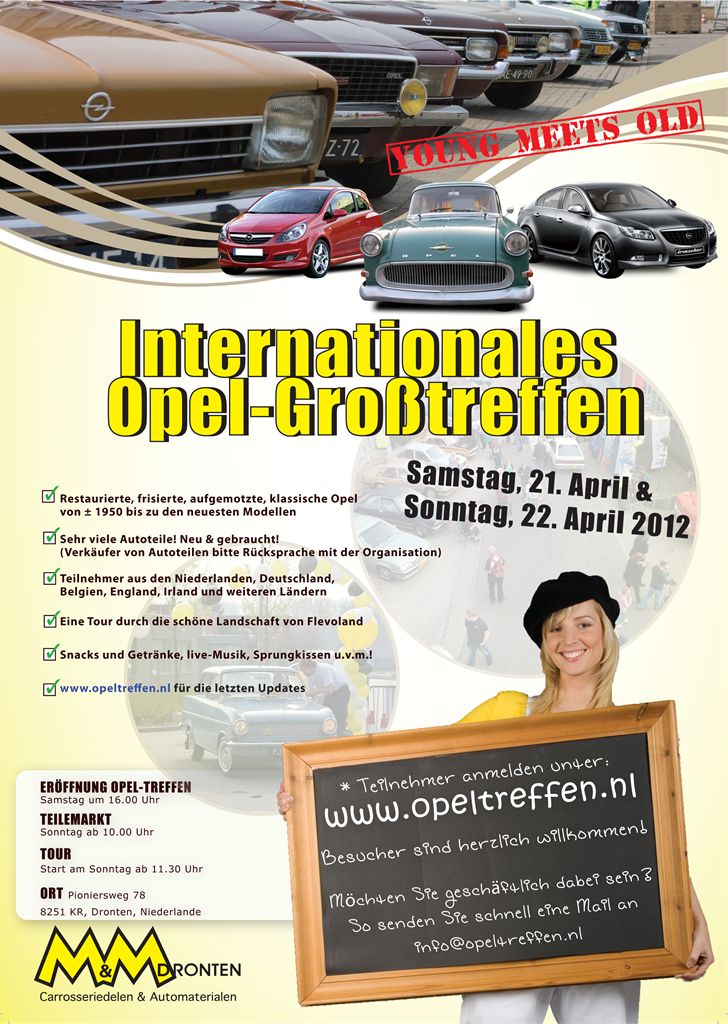 Am 21. & 22. April 2012 ist jedermann willkommen und es gibt verschiedene Aktivitäten. Besucher auf ganz Europa, mit Opels von die ganze Opel Geschichte, werden anwesend sein! Für jeden Geschmack etwas! Wenn Sie an dieser schönen Autoshow als Besucher teilnehmen möchten können Sie sich bereits jetzt anmelden auf http://www.opeltreffen.nl.