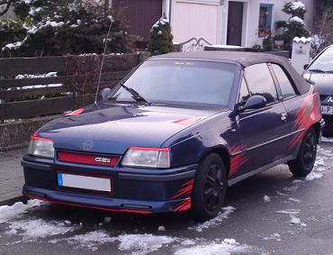 Auto wie gesagt ein Kadett GSI Cabrio. Der Kadett hat hinten gezogene Radläufe, ne richtig coole Seitenfolierung; ein, vom Vorbesitzer, selbst gemachten Schaltknauf und viele andere tolle Sachen (könnt ihr alles in meinem Profil nachlesen :))
