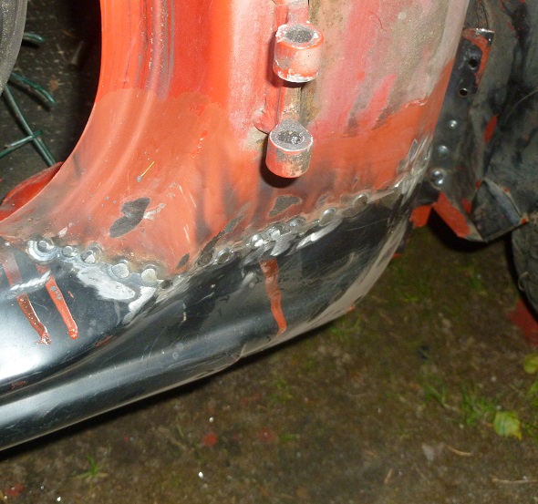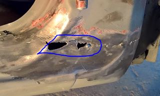Beim entfernen der ganzen Spachtelmasse habe ich nicht aufgepasst und habe mit dem Drahtbürstenaufsatz der Flex wohl zu stark gedrückt....dann hatte ich den Salat. Auf meiner neuen Metabo hat die Drahtbürste wohl mehr Biss als gedacht. Oder bin ich nur aus der Übung? Jedenfalls hab ich wohl damit die Schweissnaht zu "dünn" gemacht und ist nun aufgerissen...jetzt hab ich nen 5cent großes Loch hinten in der Seitenwand und vorne an der A-Säule auch nochmal gelocht