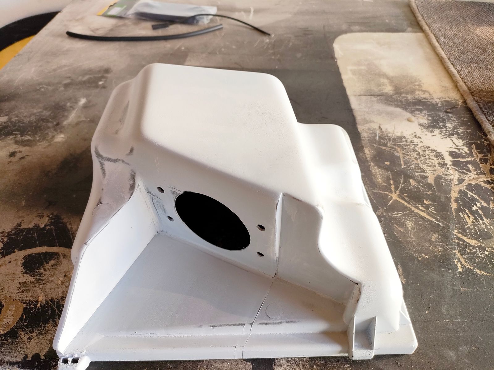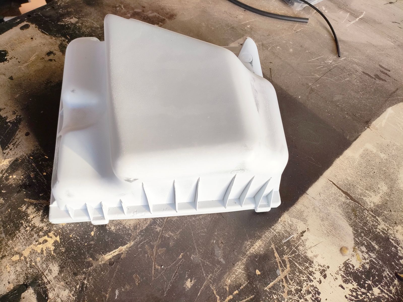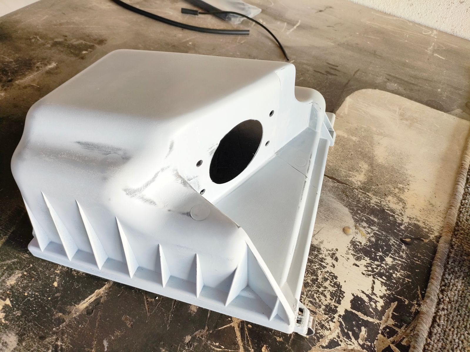 am Wochenende habe ich noch ein paar Kleinigkeiten erledigt bin aber trotzdem noch nicht fertig mit Motorraum aufräumen. Wie man auf Seite 28 gesehen hat, habe ich bereits angefangen einen NE Luftfilterkasten zu modifizieren. Am Wochenende habe ich diesen dann fertig geglättet und geschliffen. Wenn nächste Woche der Struckturlack kommt kann ich diesen endgültig fertig machen.