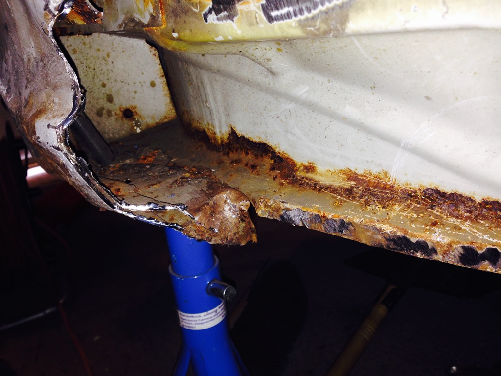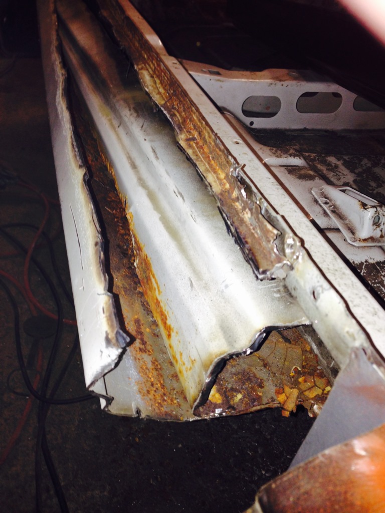 Erstmal habe ich den Schweller ein wenig weiter aufgetrennt und mehr braune Pest gefunden...das untere Rostige Blech (am Ende vom Stehblech) ist noch der Rest vom originalen Schweller. Da sind schonmal Reperaturschweller drüber gebrutzelt worden...das kommt noch alles weg!