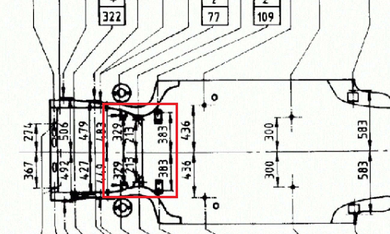 Vordere Lenkeraufnahme von Fahrzeugmitte nach außen 329mm, Gesamtabstand 658mm von Schraubenlochmitte links zu Schraubenlochmitte rechts.