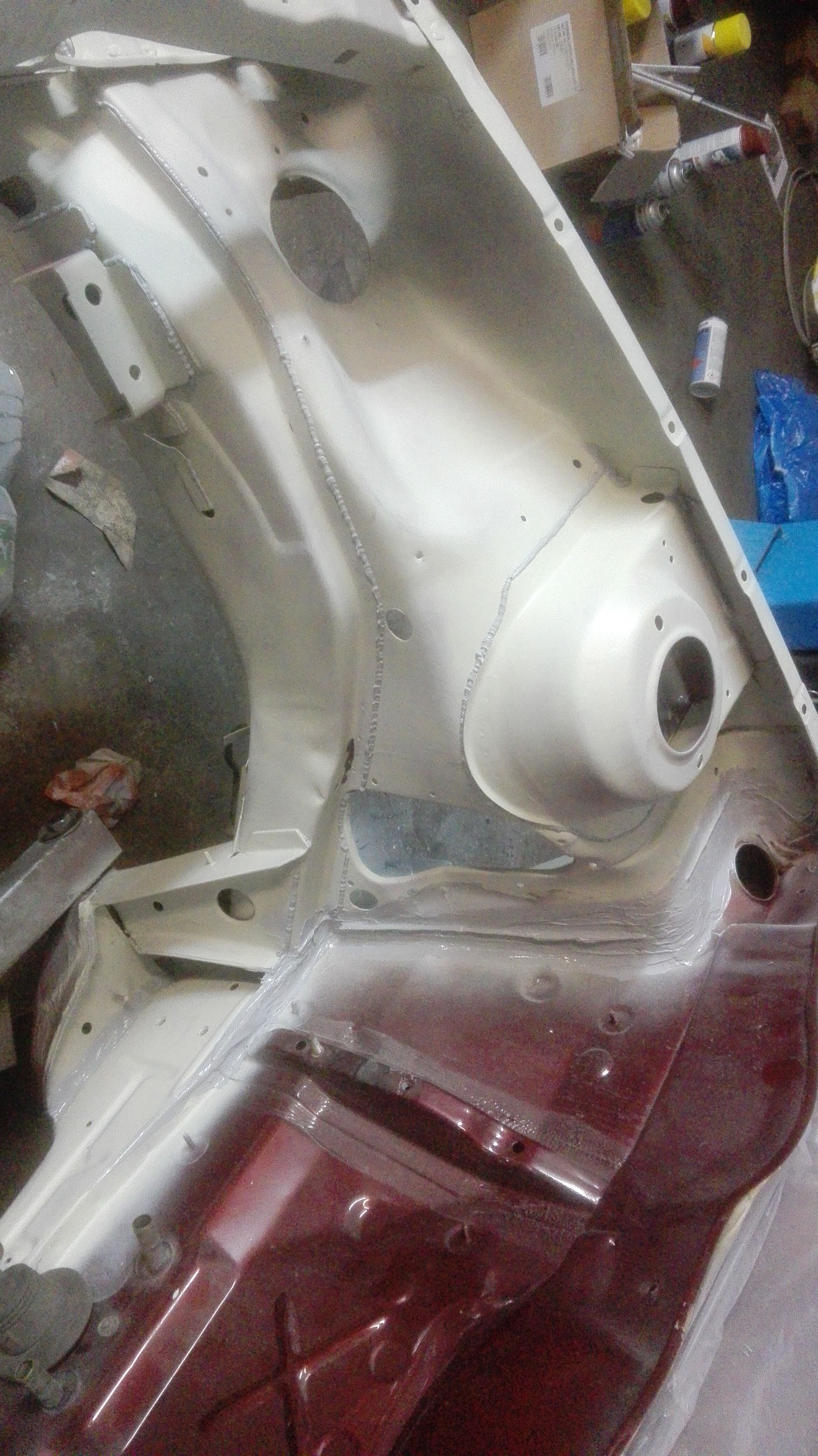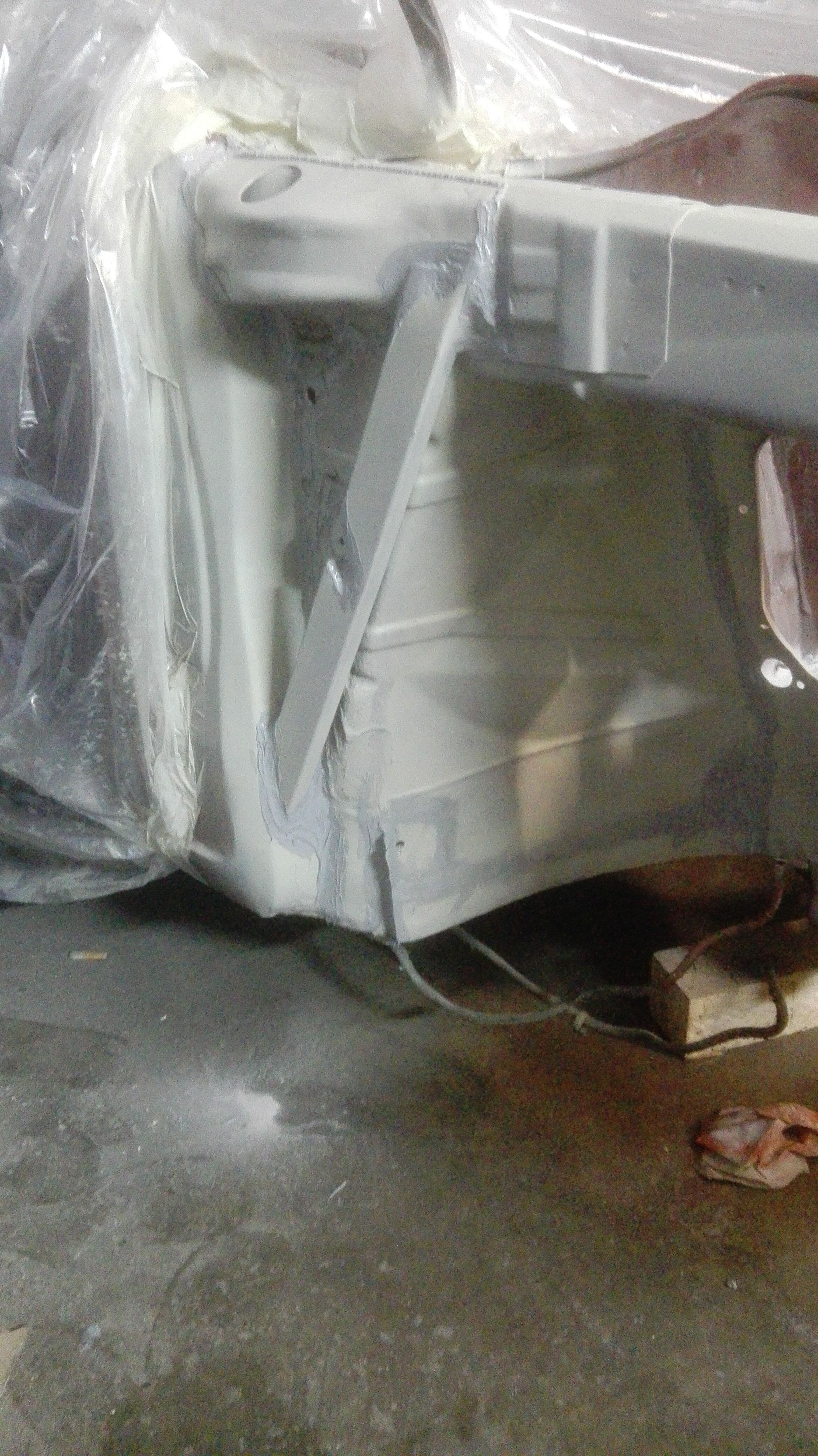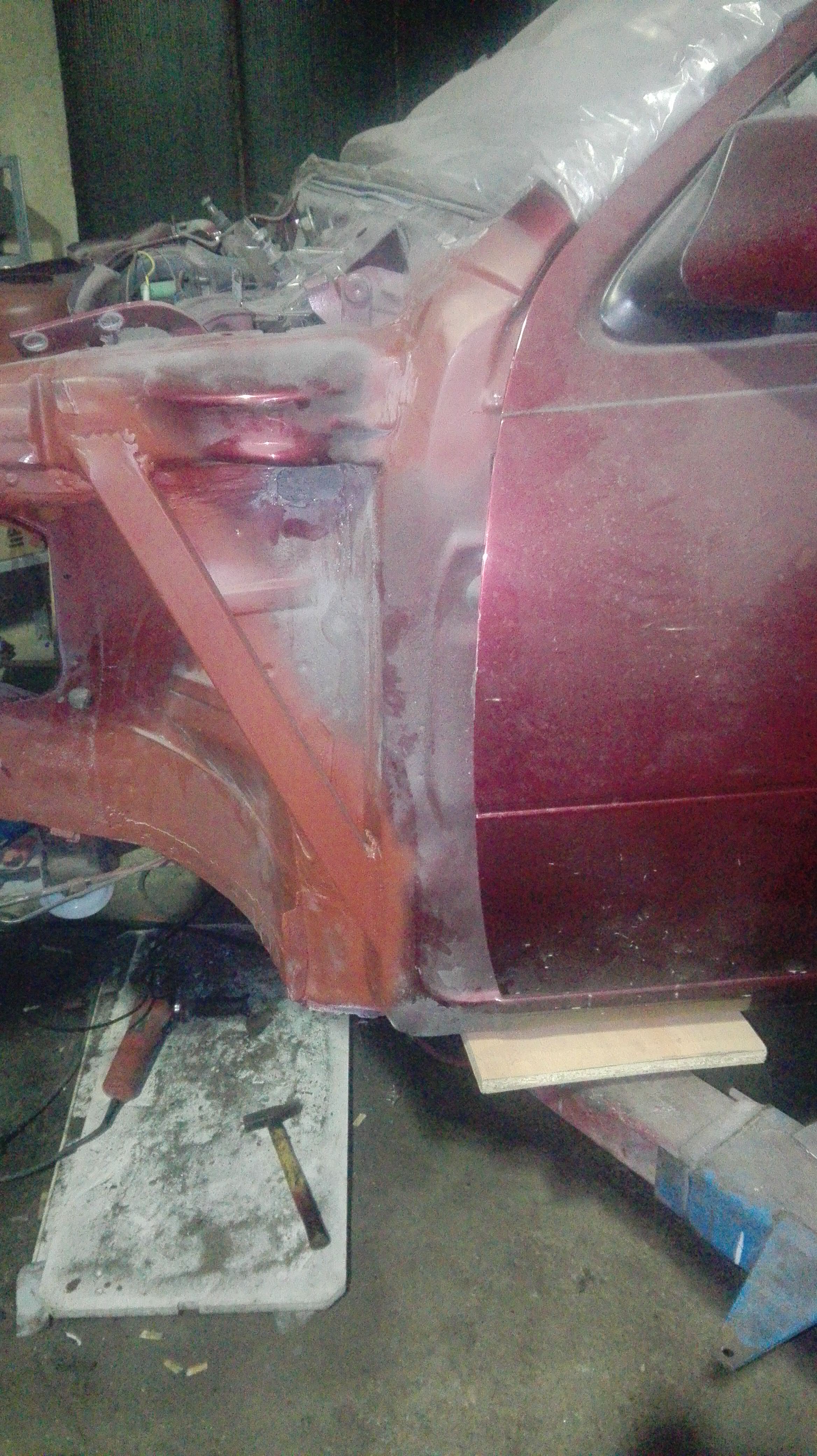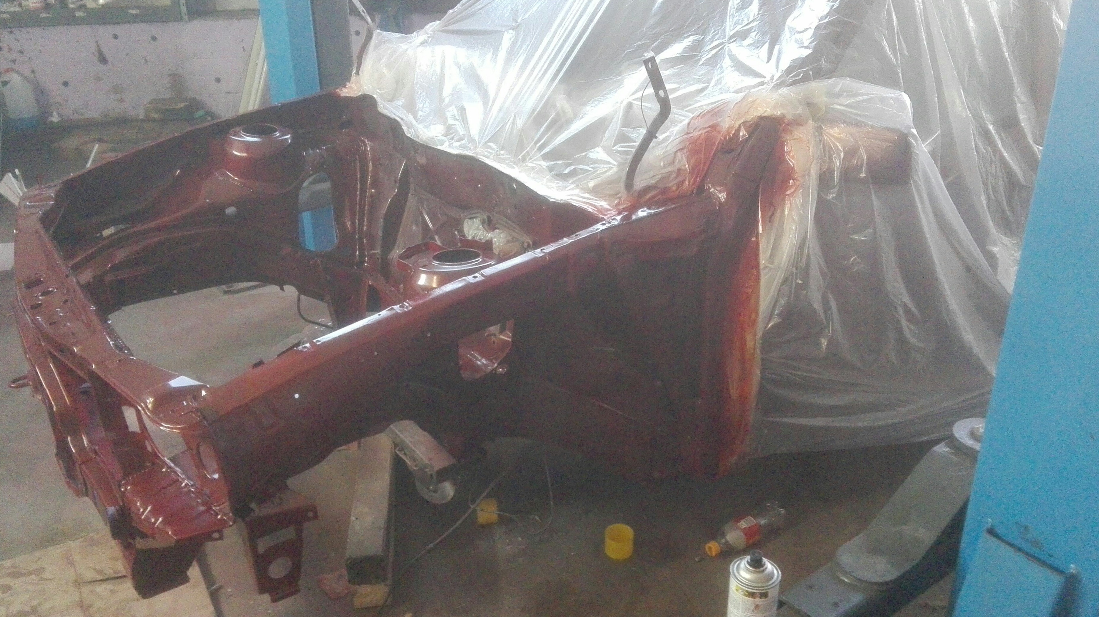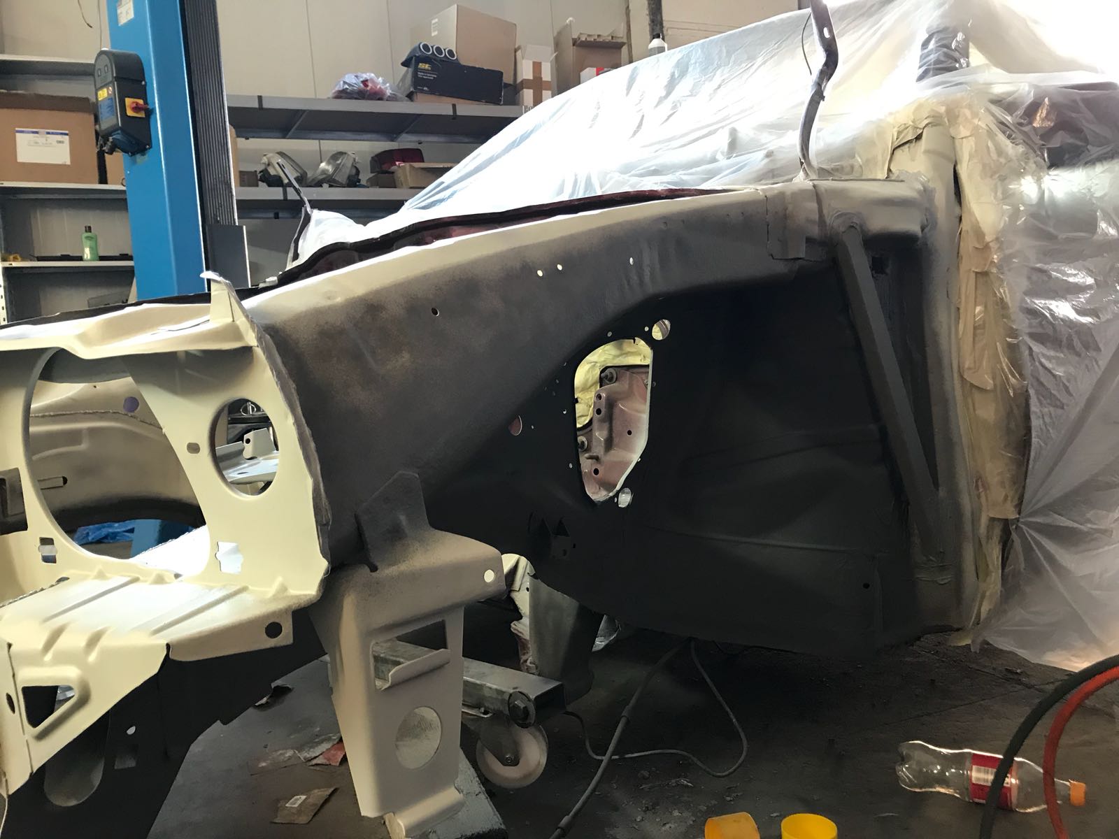 Bisher wurde grundiert, gespachtelt, verzinnt, gefüllert, abgedichtet und die Radhäuser mit überlackierbarem Steinschlagschutz gespritzt. Morgen habe ich eine Kabine und der Wagen erstrahlt wieder in seinem originalen Bordeauxrot-Metallic. -