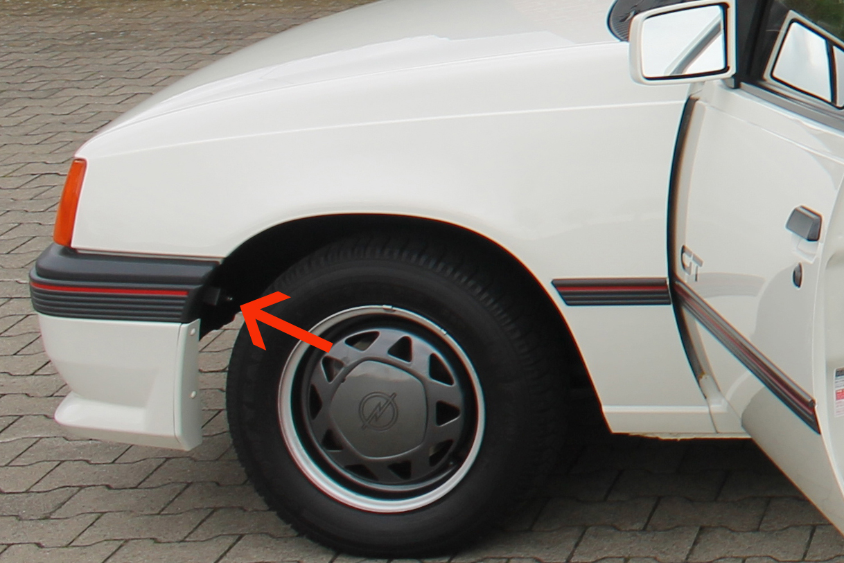 Der sitzt hinterm linken Kotflügel unterhalb des Scheinwerfers ungefähr.