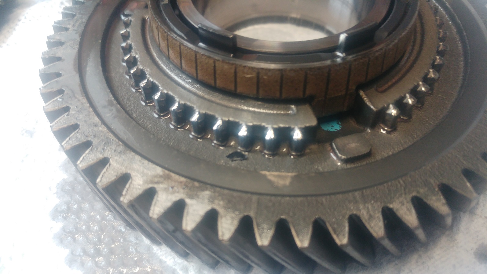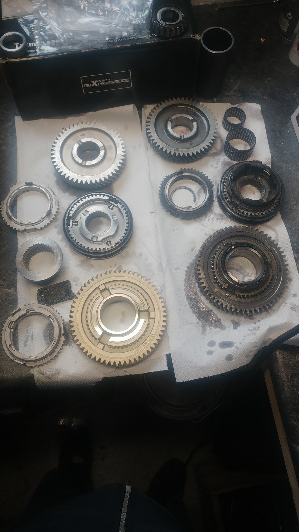 Wie man deutlich sehen kann sind der 3&4 gang neu gekommen (die hellen) zudem ist der syncronkörper vom 2.Gang sowie 5 Lager erneuert wurden ... die Lagervorspannung war um 1/10 zu fest ... typischs m32 DramaAnbei mal kleine Details von nem tadellos laufenden m32 Getriebe , 125tkm, mit Samthandschuhen bewegt ...