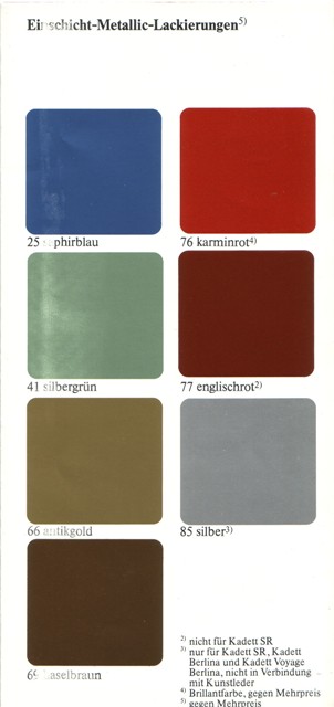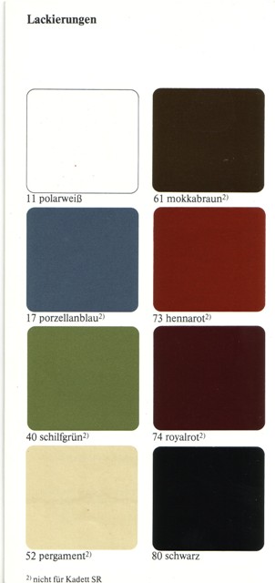 Demnach hat´s für den D-Kadett insgesamt 30 verschieden Farbtöne gegeben. Manche waren gerade mal 1 Jahr lang verfügbar.