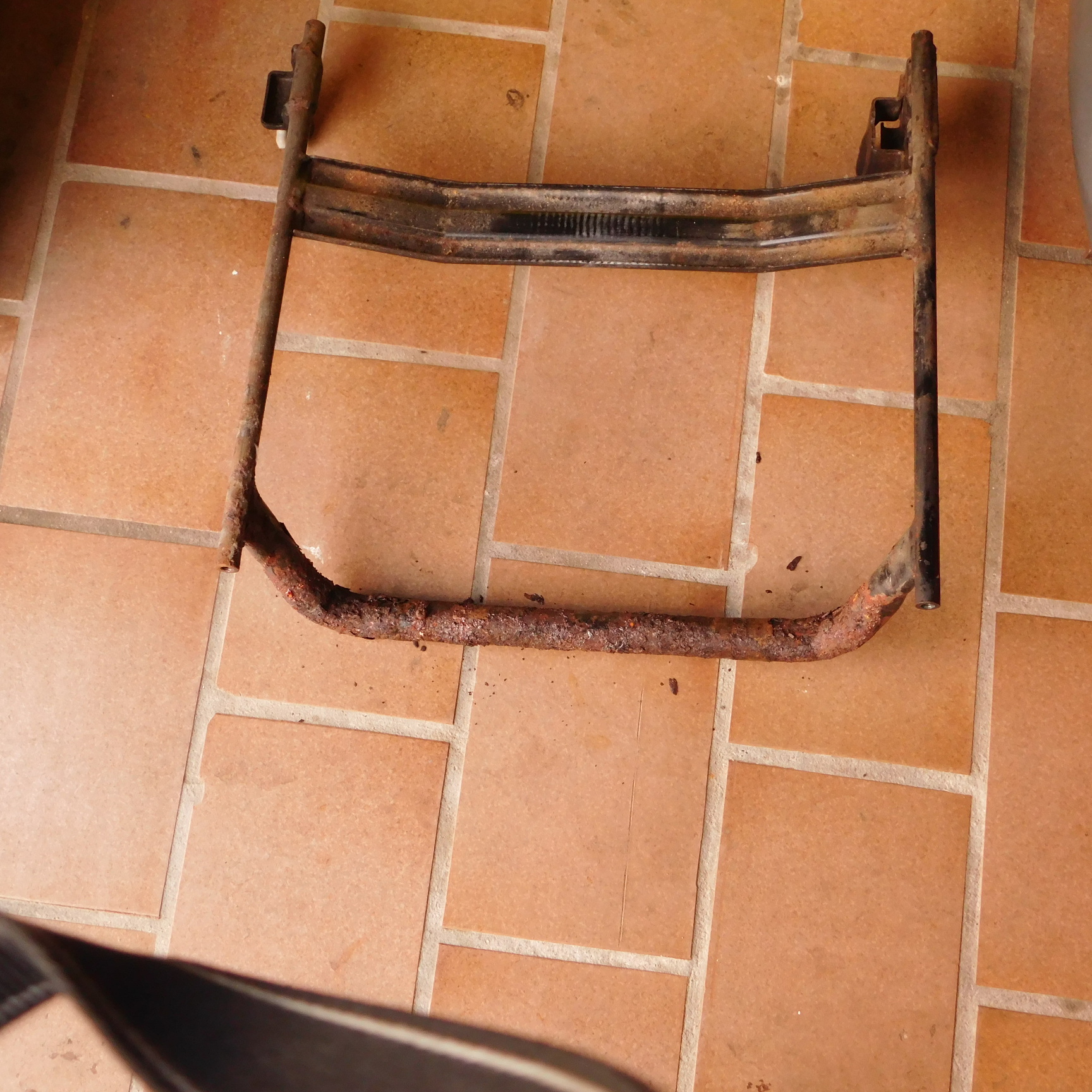 Dann kann man schon mal die Innenausstattung raus holen... Oha.. Die Sitzkonsole ist am unteren Rohr "gewachsen" ;(