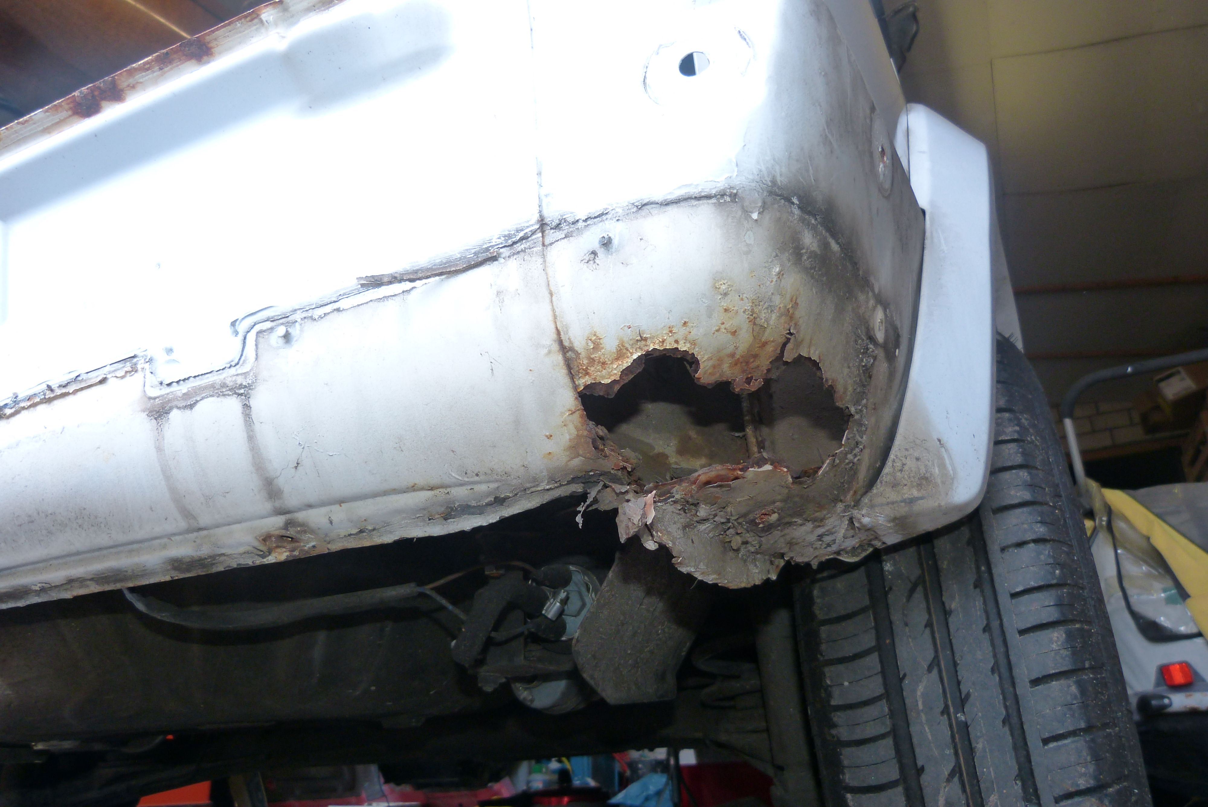Tja. Als ich die Stoßstange abschraubte, hab ich es schon gesehen... Vom Vorrestaurator gekonnt zugeschmiert mit Karosseriedichtmasse. Das Zeug ist eh überall bei dem Karren...