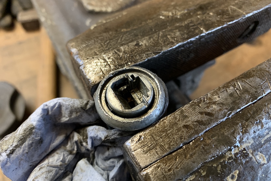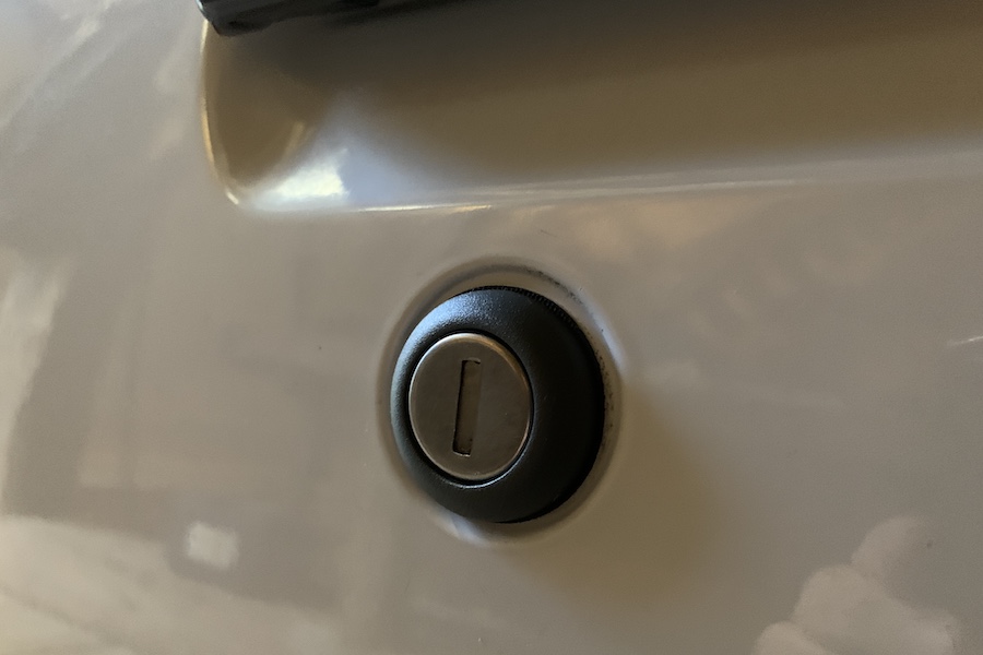 Das Hauptthema der kleinen Veränderungen waren die beiden Schlösser in den Türen, das Heckklappenschloss und der Schlüssel selbst. Den Schlüssel habe ich anhand der Schlüsselidentnummer aus dem Fahrzeugbrief nachfertigen lassen. Das Heckklappenschloss habe ich ausgebaut, gereinigt und neu gefettet. Am meisten Sorgen machte mir das Türschloss auf der Fahrerseite. Wie man auf dem Foto erkennen kann, war dort wohl schon mal jemand dran, da ringsherum deutliche Hebelspuren erkennbar waren.