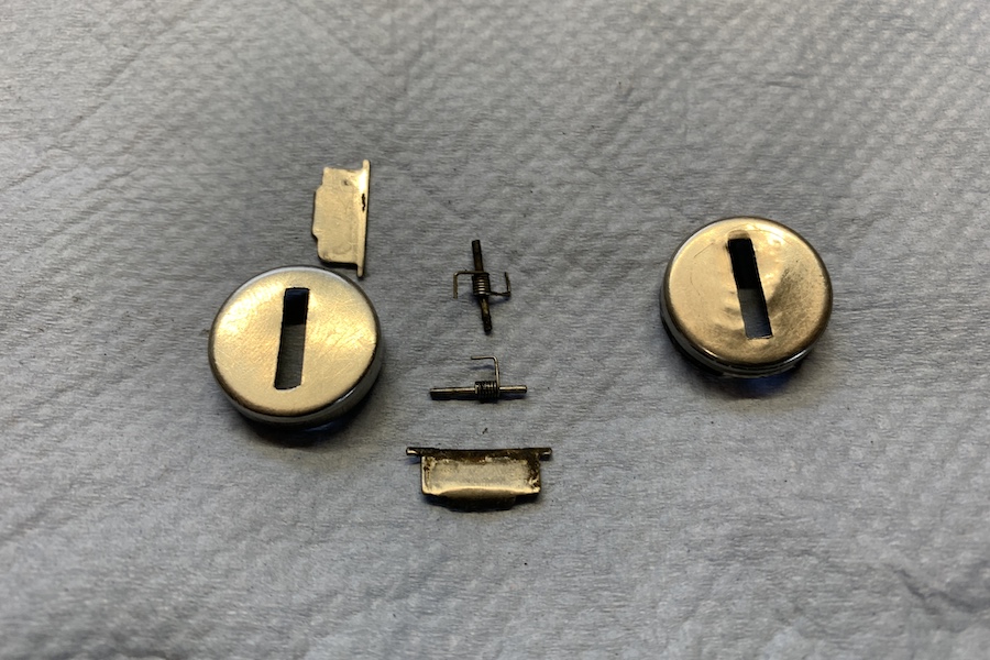 Das erkennt man auch an der alten Schlossabdeckung (rechts im Bild). Dazu kam noch, dass das Schutzplättchen nicht mehr zurückkam. Es fehlte komplett und die Feder fürs Rückhalten war gebrochen. Ich habe dann in meiner Schlosskiste gewühlt und konnte gute Ersatzteile finden. Der Zusammenbau war zwar ziemlich fummelig, aber ich habe es geschafft.