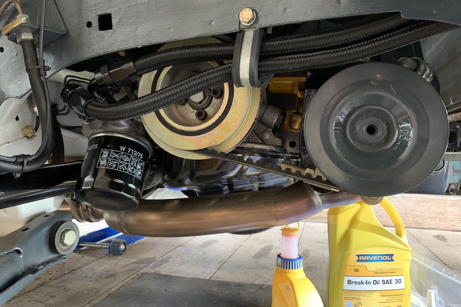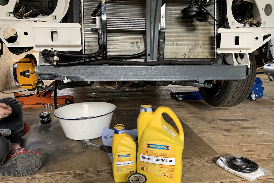 ...und die Leitungen angeschlossen. Den Motor habe ich mit Ravenol SAE 30 Break-In Oil befüllt. Das ist spezielles Einfahröl für neue Motoren. Später werde ich Ravenol Opel Motorsport Öl in 15W50 fahren.