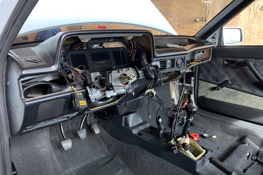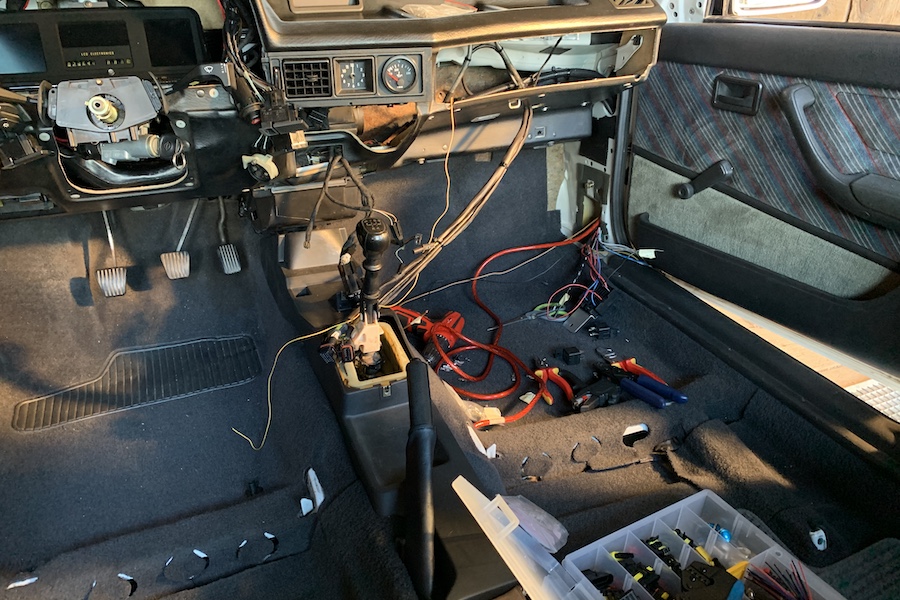 Im Innenraum war noch viel zu tun. Dort wo serienmäßig das Steuergerät sitzt, sitzen jetzt die Sicherungen und Relais für die Steuerung. Die Steuerung selbst wird später noch zusammen mit dem Lambda-Controller im Handschuhfach untergebracht.