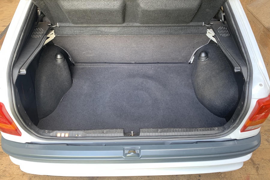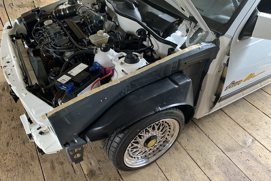 Im Kofferraum habe ich, als ich das zusätzliche Kabel für die Bremslichtkontrolle ziehen musste, die Radhausverkleidungen aus dem Schlacht-16V angebracht.