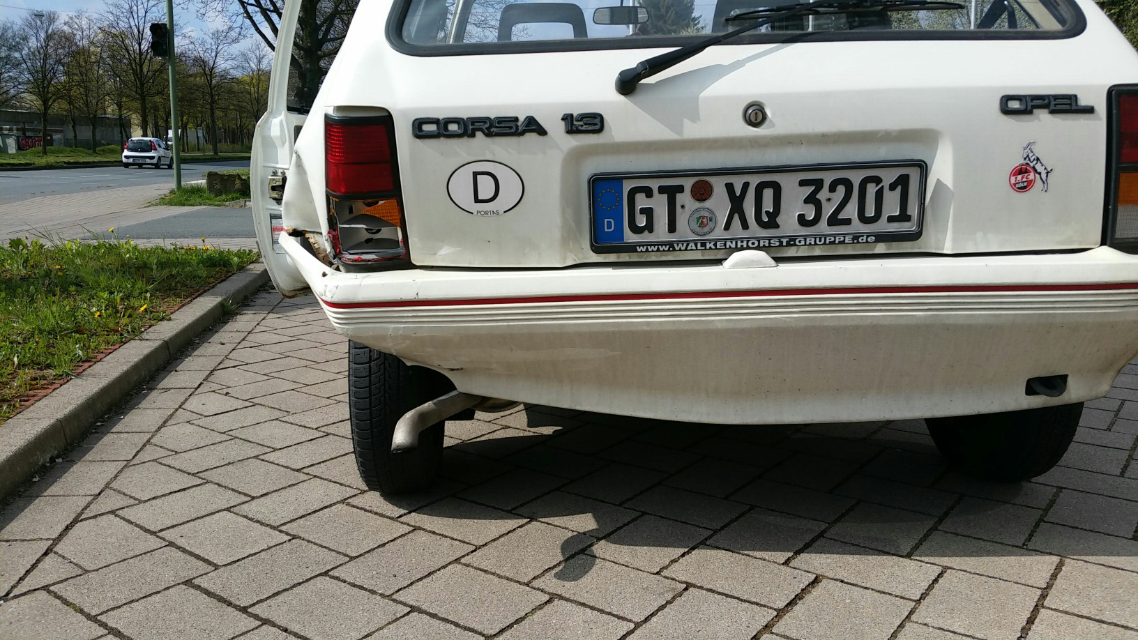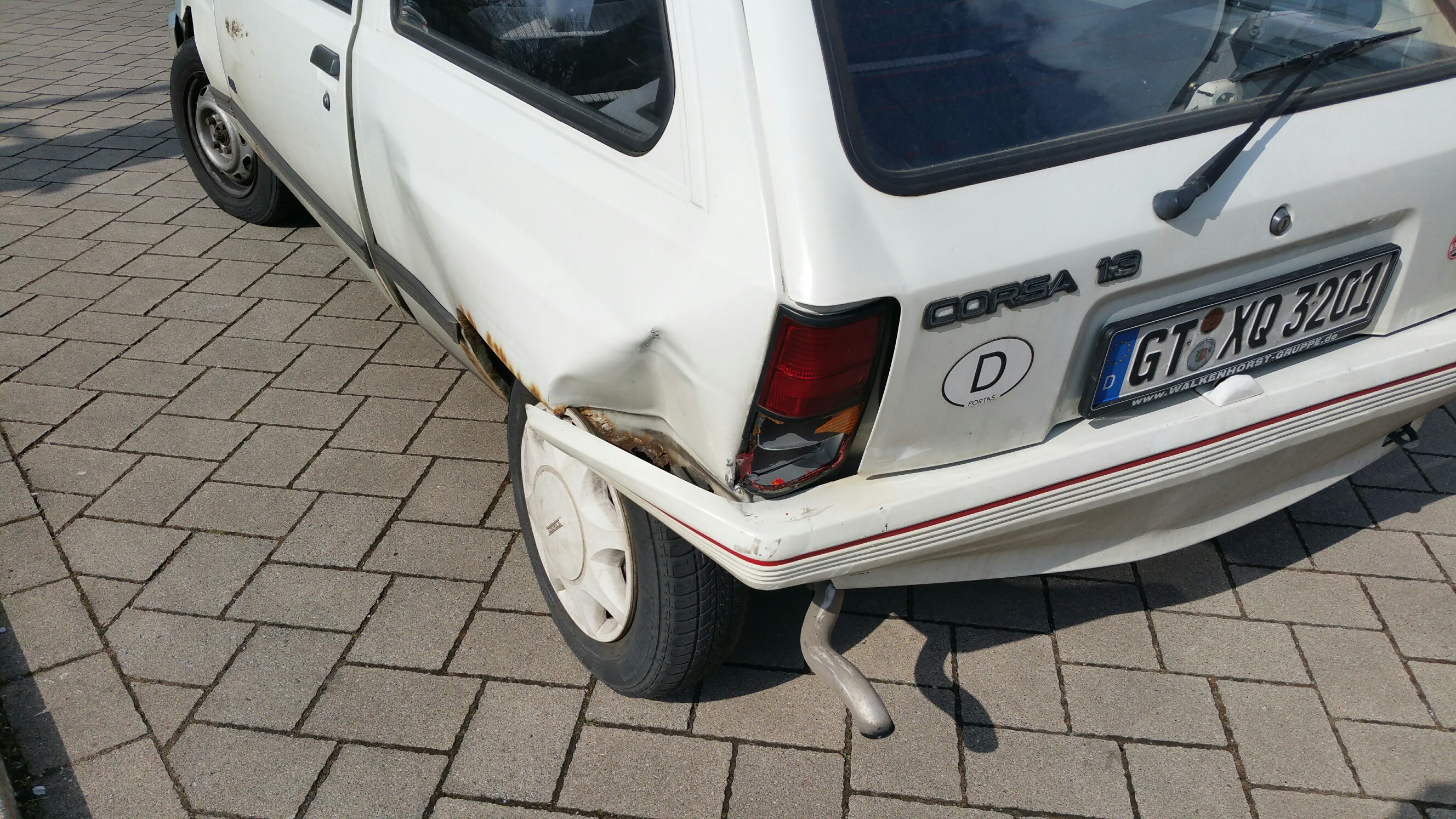 An der Feuerwache ist die Haltelinie wegen der Feuerwehrausfahrt gute 20m vor der Ampel. Da hat der gute gedacht, er könne durchrauschen.Fahrertür geht nicht mehr zu, Seitenteil eingedrückt, Heckblech eingedrückt, Stoßfänger nicht mehr ganz gut. Bei aller Liebe, das wäre bei dem 87er auch 1992 wirtschafticher Totalschaden gewesen.