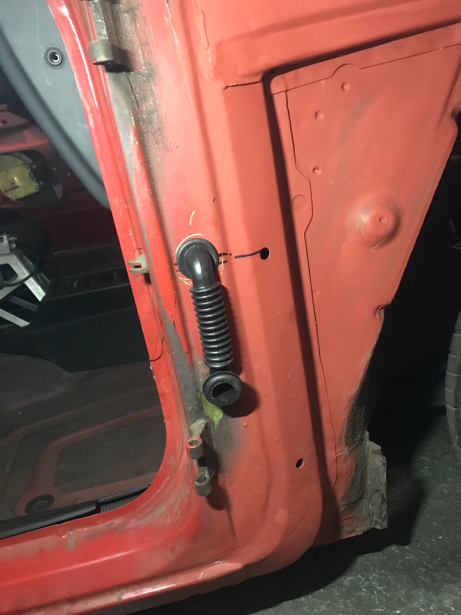 Im Holm (B-Säule) ist die Tülle fest, in der Tür fährt sie halt mit ein und aus, Durchmesser dürften geschätzte 3-4cm sein, ausreichend für das Kabel für die Ansteuerung des FH-Motors.