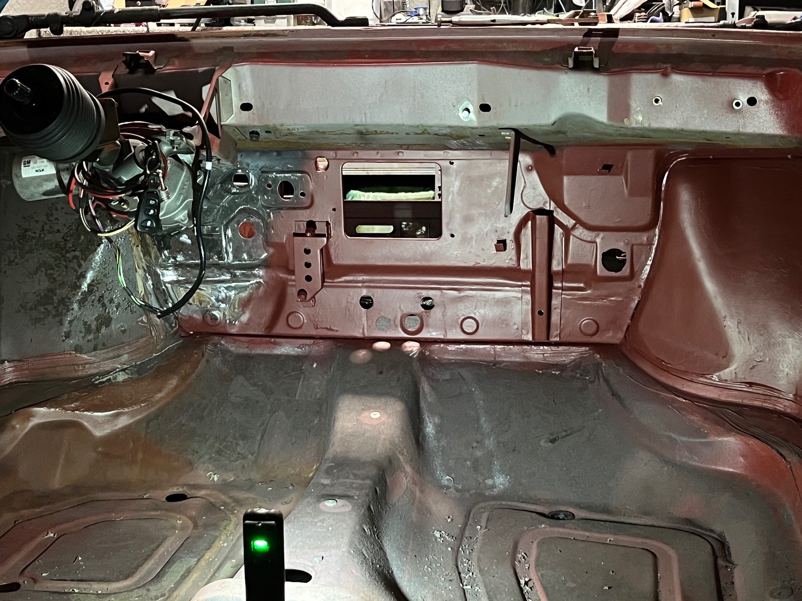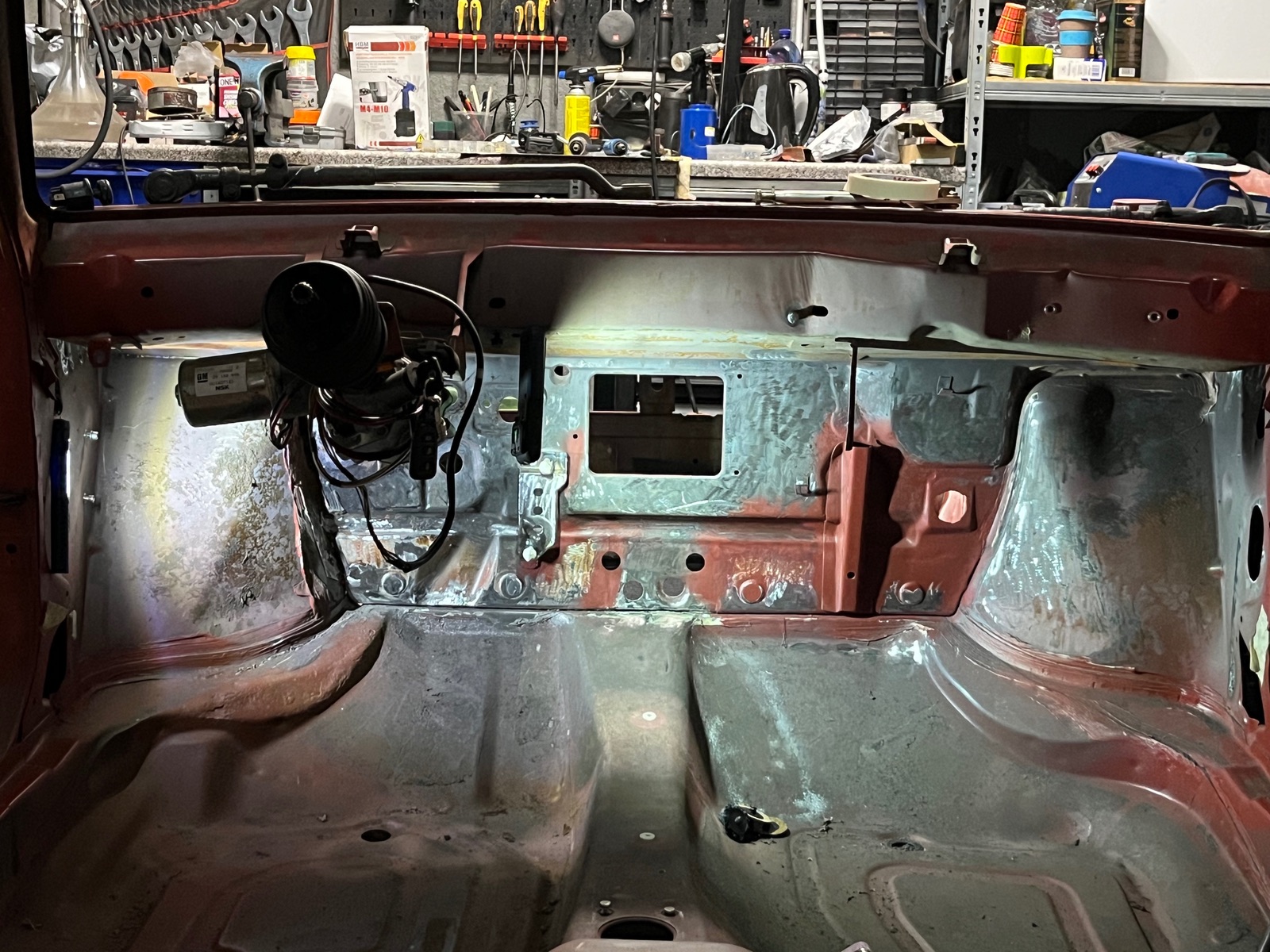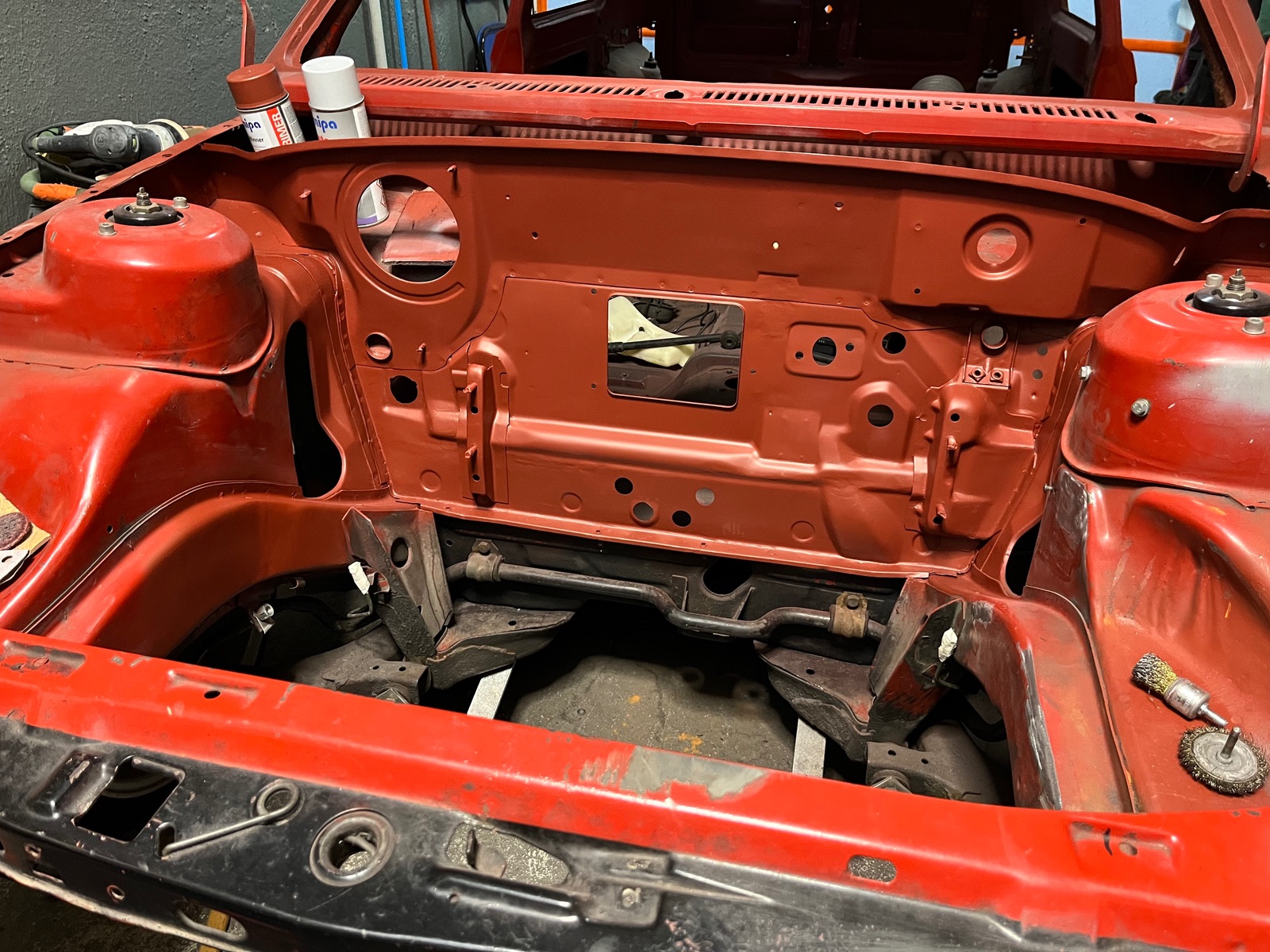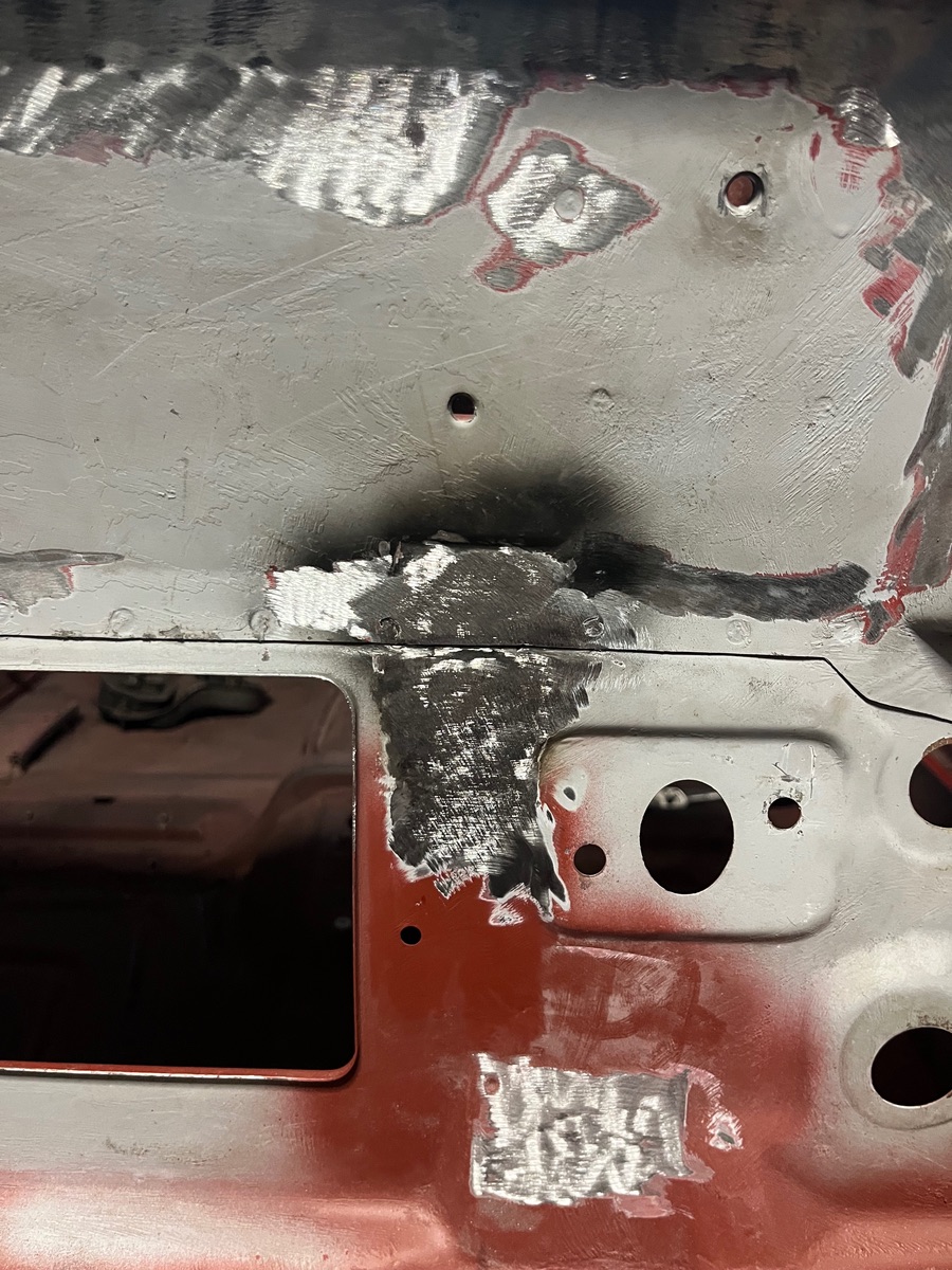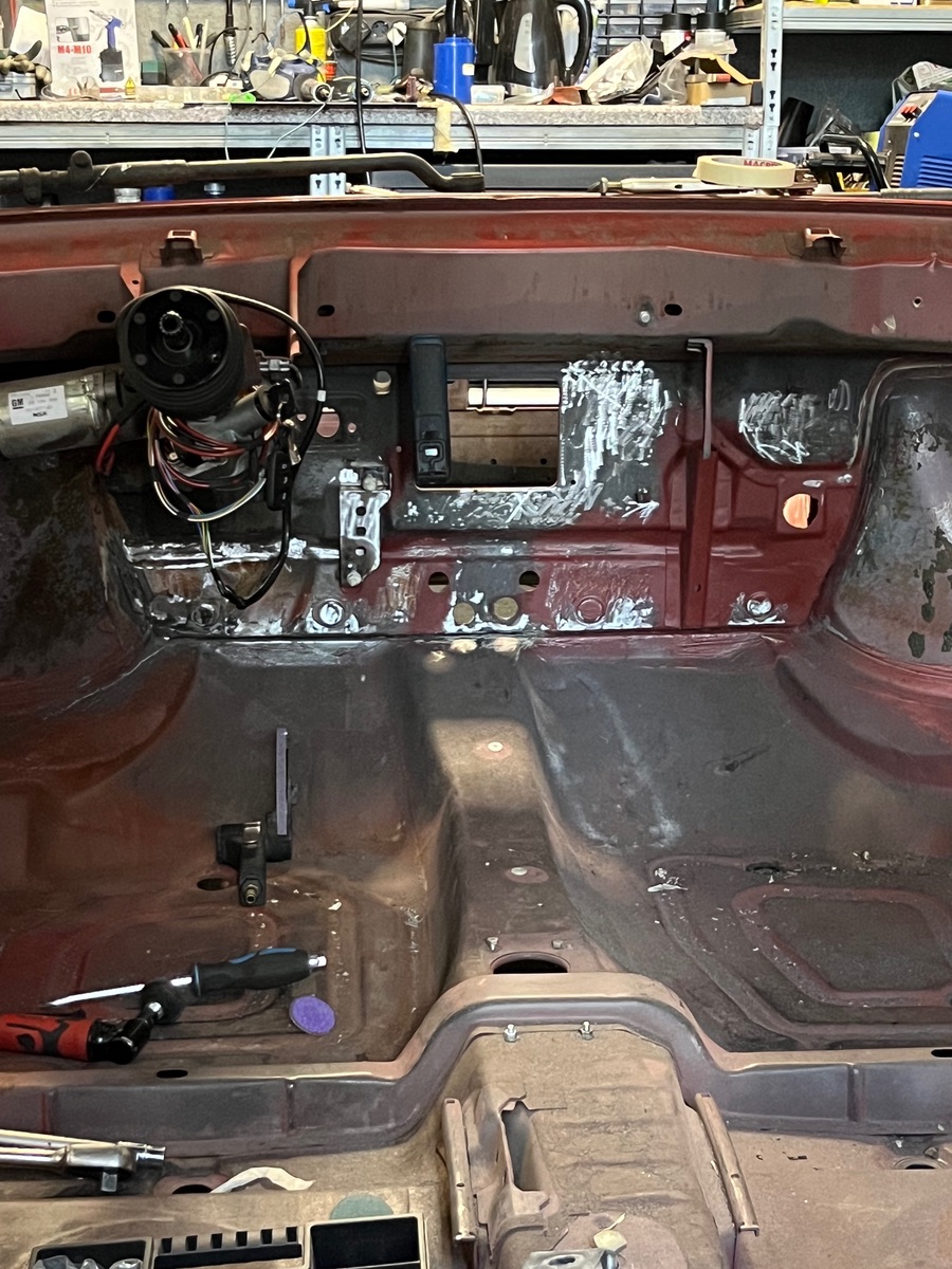 Habe leider davon keine genauen Bilder gemacht. An der Spritzwand im unteren Bereich waren löcher. Da das Blech auch recht angegriffen war habe ich es durch neue Bleche aus einem Schlachter ersetzt.