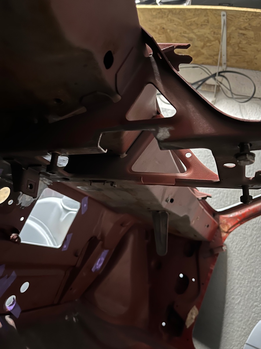 Den unteren Stehbolzen habe ich mit einem winkelblech von hinten extra verstärkt. Um den Oberen Stehbolzen zu verstärken, habe ich genau dahinter wo der Halter mit dem Stehbolzen an der Spritzwand sitz ein Loch gebohrt und vom Motorraum aus den Bolzen nochmal mit der Spritzwand verschweißt.