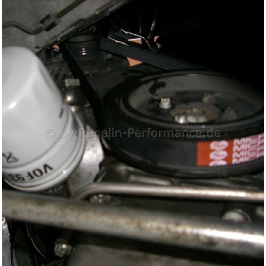 somit wird nur die Lichtmaschine angetrieben. Das problemdabei ist, dass der Riemen dabei sehr oft an die Anschlüsse des Ölkühlers am ölfilter dran kommen. Hier mal ein Bild aus dem Netz.