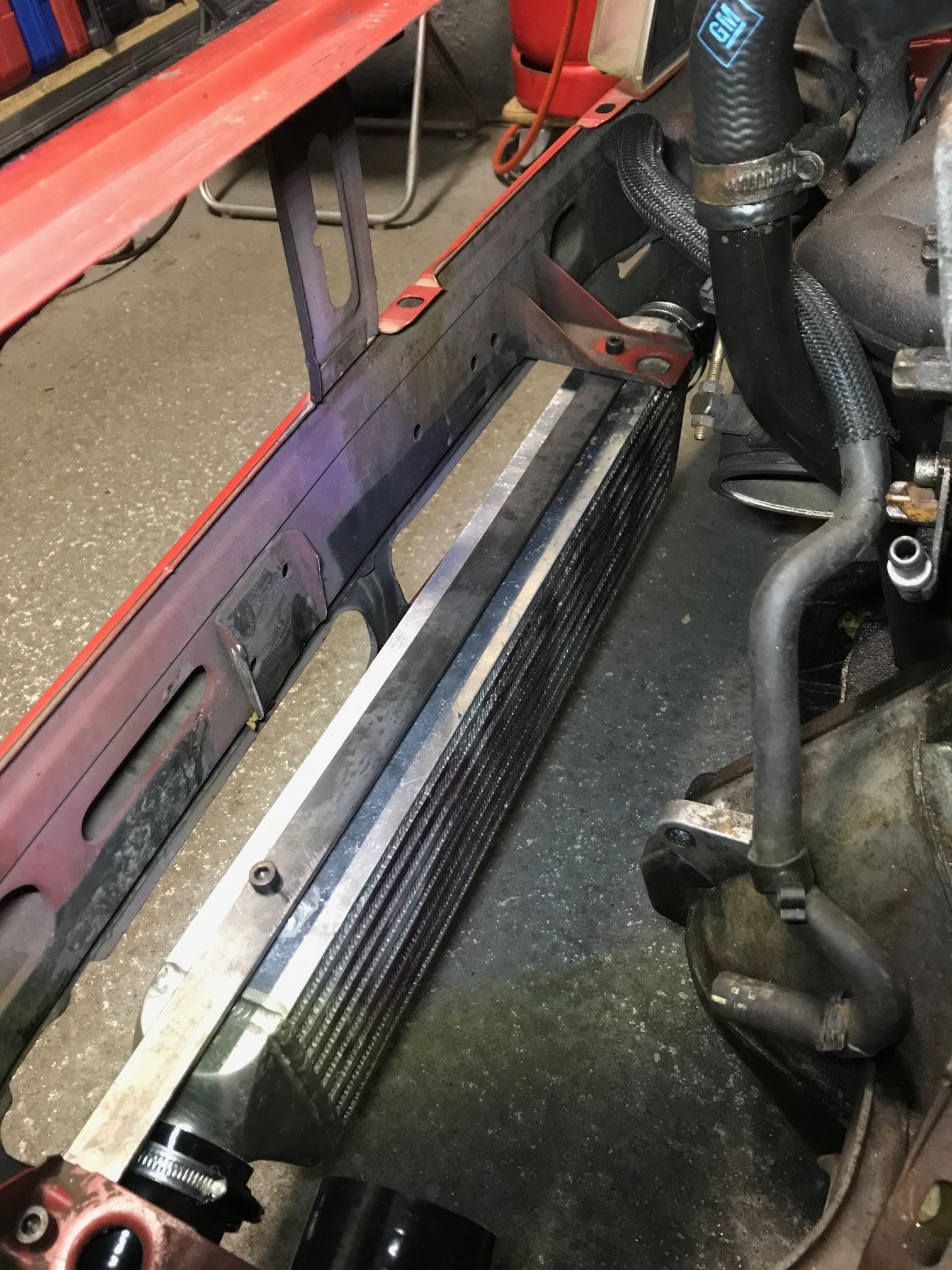 Hier mal ein Bild wie ich es montiert habe. Simpel mit einem Flacheisen. An die Kühlerhalterung Montiert. Der LLK sitzt etwas hinten, da ich einen Luftsammler bauen möchte um genug Luft zum LLK bekomme. Und da die Front eine leichte V form hat sah es optisch komisch aus als ich den LLK näher drangehalten habe.