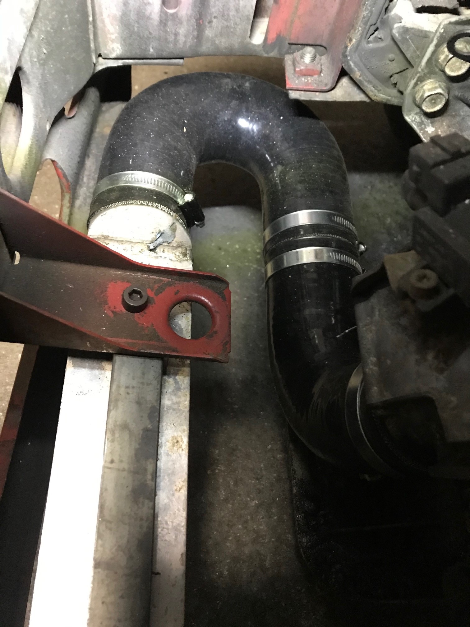 Und hier mal ein Bild von der Verrohrung vom Lader zum LLK. Ein 180° bogen / ein 90° reduzierbogen und ein Verdinder. Schlichte schwarze schläuche.