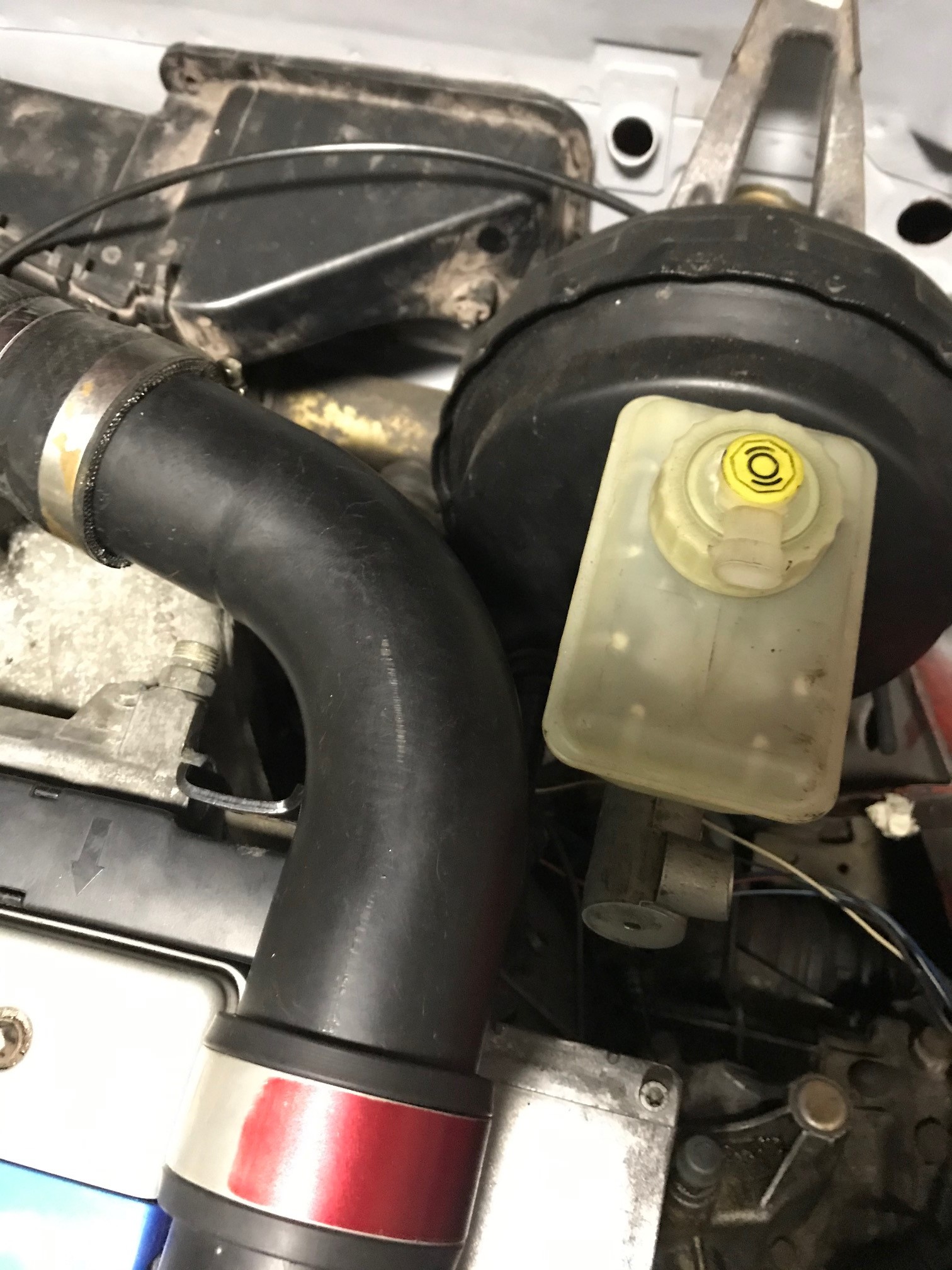 Hier mal ein Bild wie knapp es zum Bremsflüssigkeitsbehälter ist. Das Saugrohr hae ich dann mit einem gragen silikonreduzierer mit dem Ansaugstutzen verbunden.